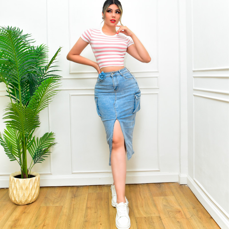 Falda midi de mezclilla, abertura frontal, bolsillos tipo cargo laterales. Incluye accesorio de flor.