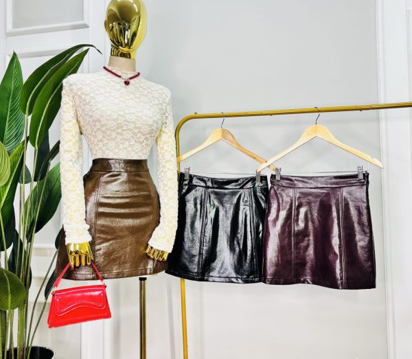 Falda mini en vinipiel con acabado brillante, ideal para looks modernos y sofisticados. Diseño con costuras al frente que estiliza la silueta y realza la figura. Cierre invisible lateral. Incluye short de forro para mayor comodidad. Un básico que combina con todo. 🥰