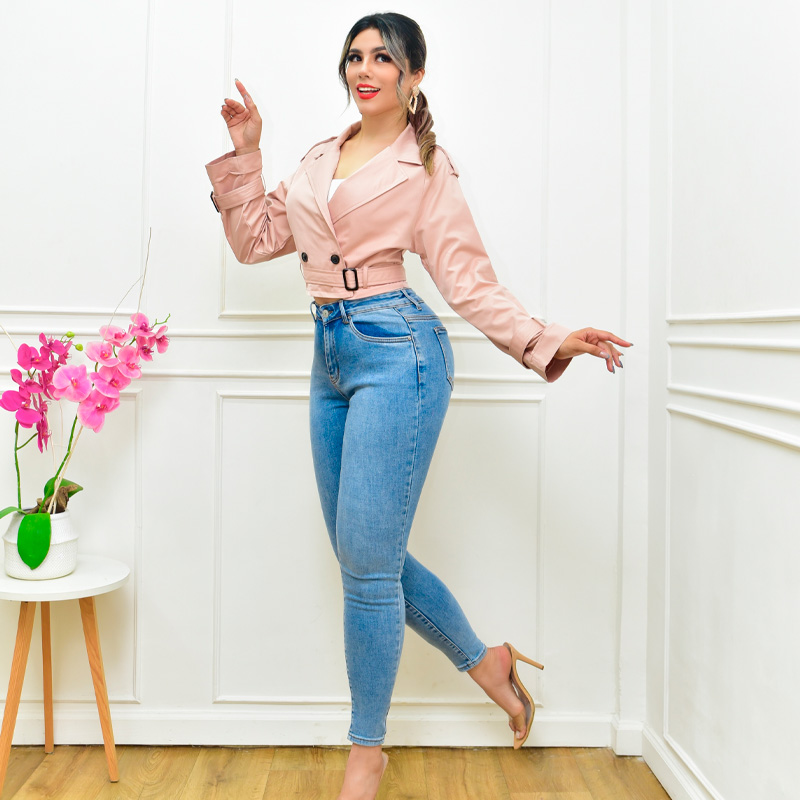 Gabardina corta corte cruzado con botones. Cintas y botones sujeta bolsas en hombros. Incluye cinta.