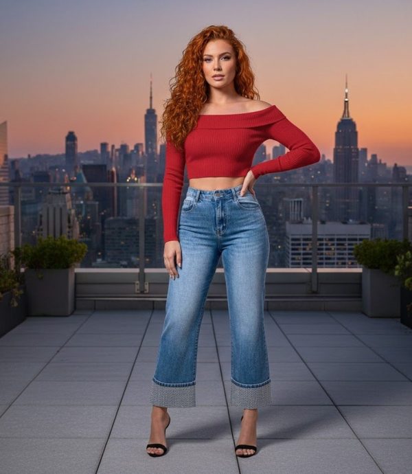 Jeans de mezclilla corte recto. Aplicación de pedrería en parte baja de la pierna. Mezclilla de alta calidad.