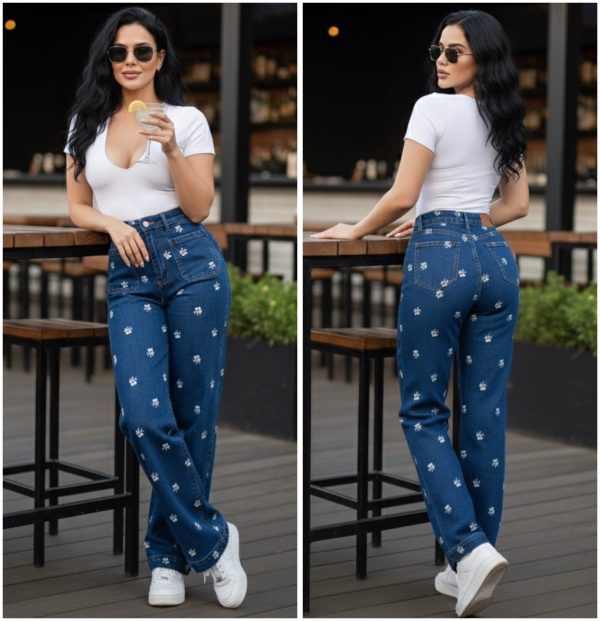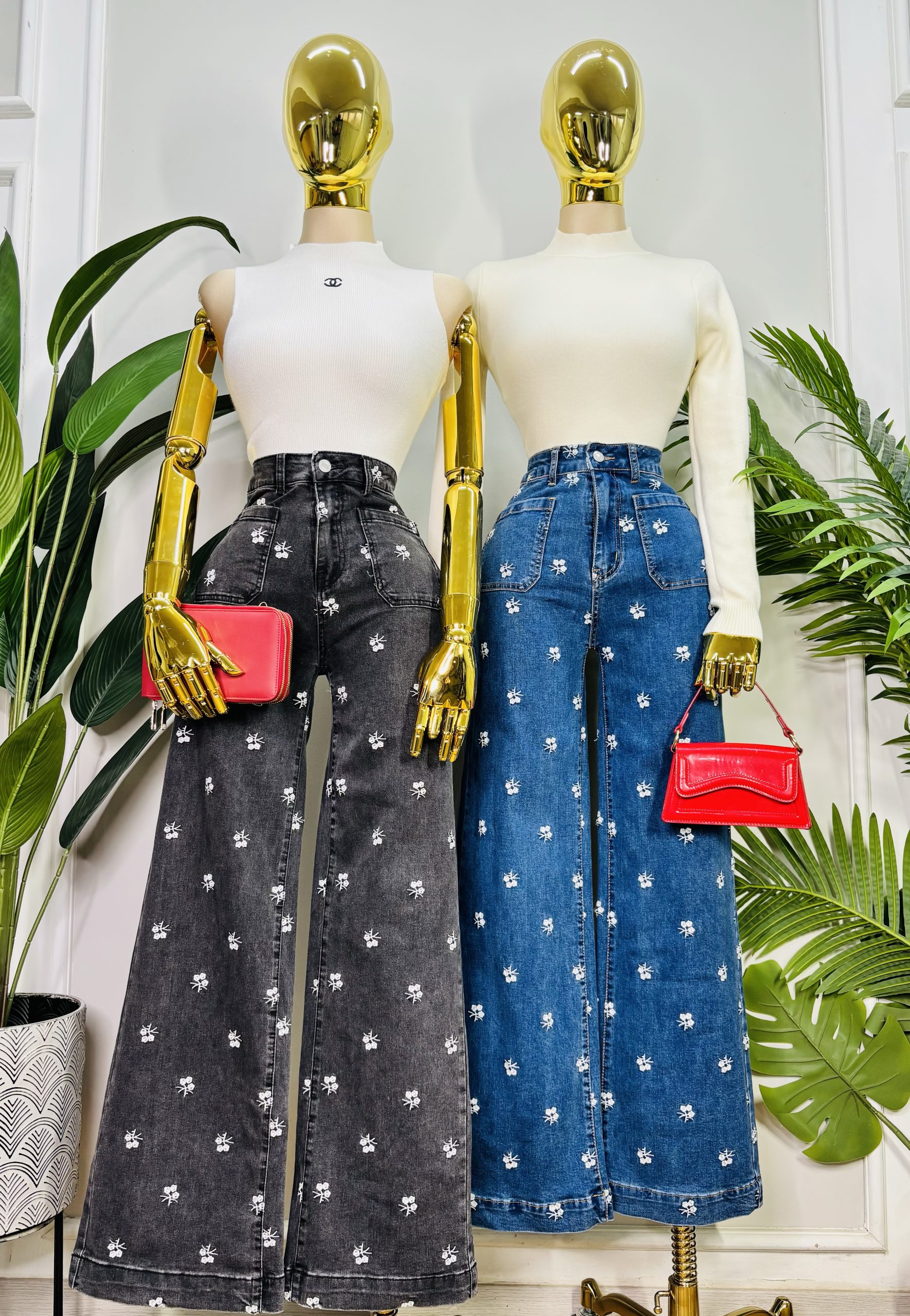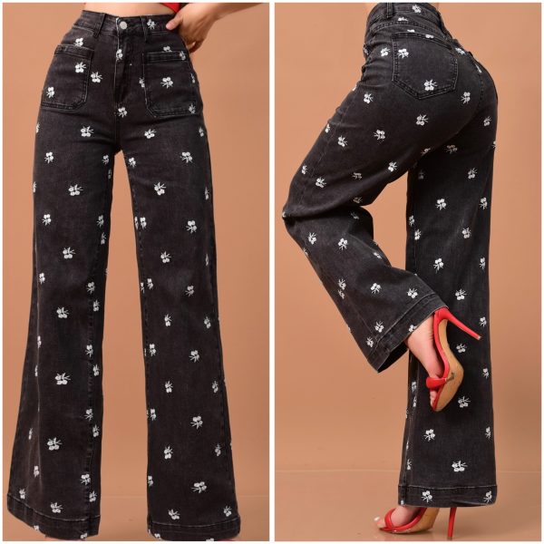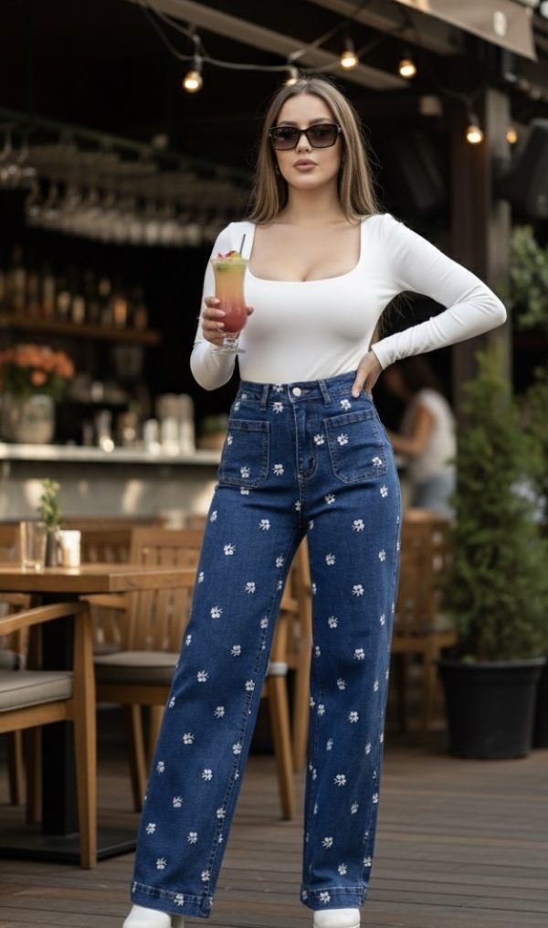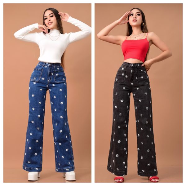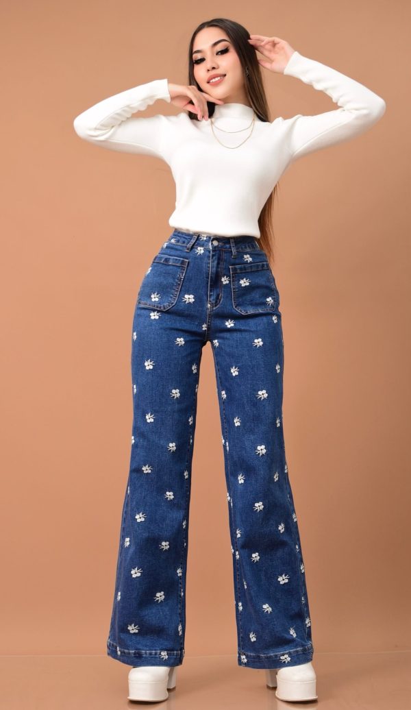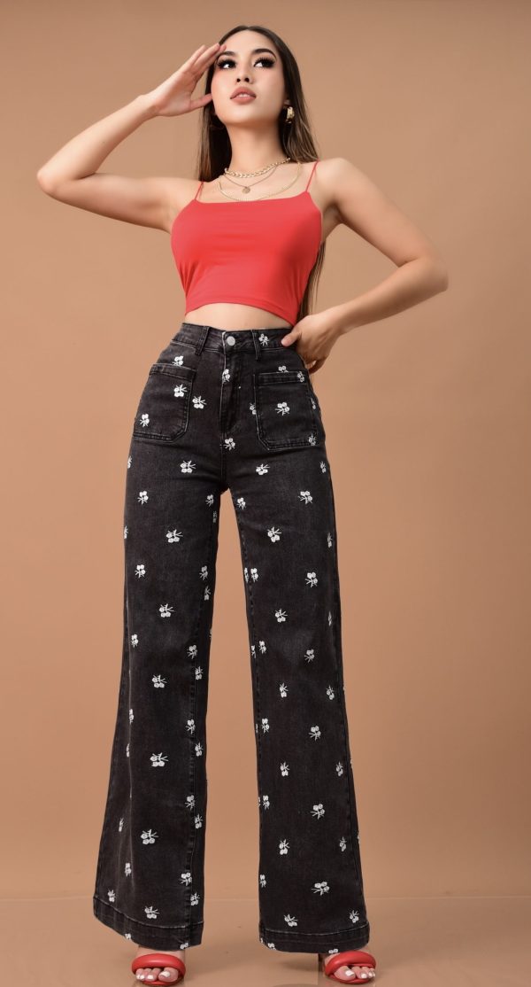 Jeans wide leg confeccionado en mezclilla stretch. Tiro alto. Detalle de flores bordadas que le dan un toque femenino y moderno 🌸. Bolsillos delanteros y traseros funcionales. Ideal para combinar con blusas básicas o tops y lograr un look casual con estilo. ✨