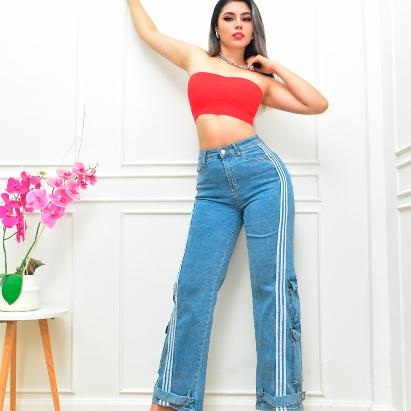Jeans de mezclilla semi-stretch con un moderno detalle de rayas laterales que aporta un toque deportivo y casual al look. Cuenta con bolsillos tipo cargo y un diseño único que destaca en cualquier atuendo. Su ajuste semi-stretch asegura comodidad y flexibilidad para todo el día, adaptándose a la silueta.