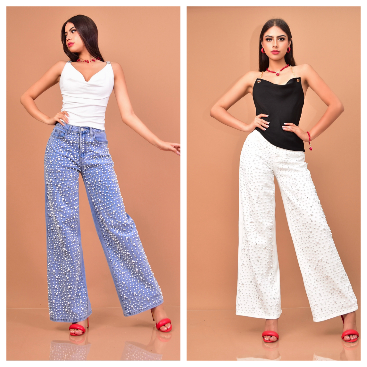 Jeans corte wide leg (pierna ancha) con aplicaciones de perlas en diferentes tamaños y pedrería que le dan un efecto moderno y glam. Confeccionados en mezclilla stretch de excelente calidad. Tiro alto y bolsillos frontales y traseros.