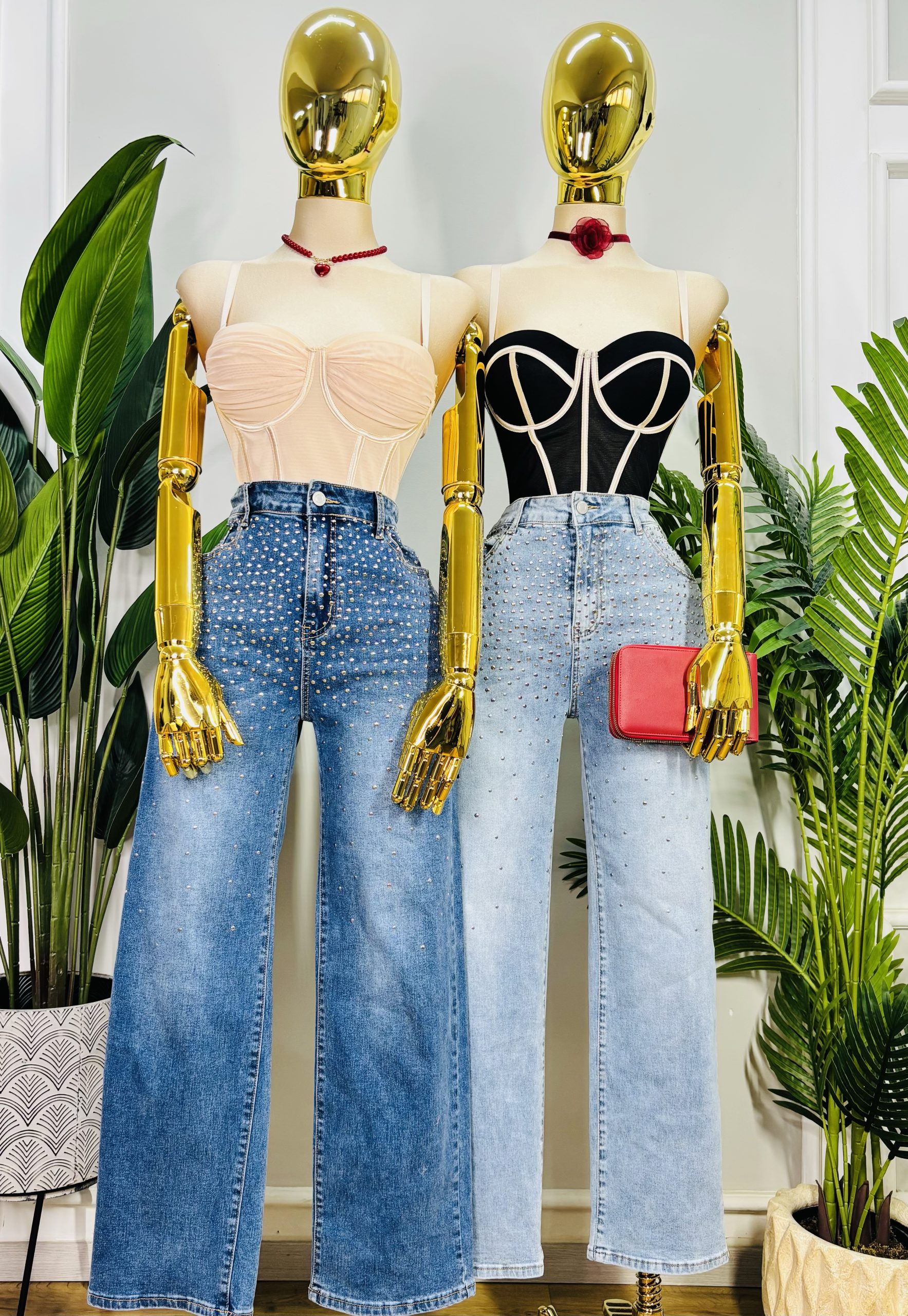 Jeans de tiro alto, confeccionados en mezclilla semi stretch de corte recto. Diseño con aplicaciones plateadas brillantes al frente, que aportan un toque moderno y llamativo. Bolsillos funcionales. Una prenda versátil con un estilo chic. 🫶🏻