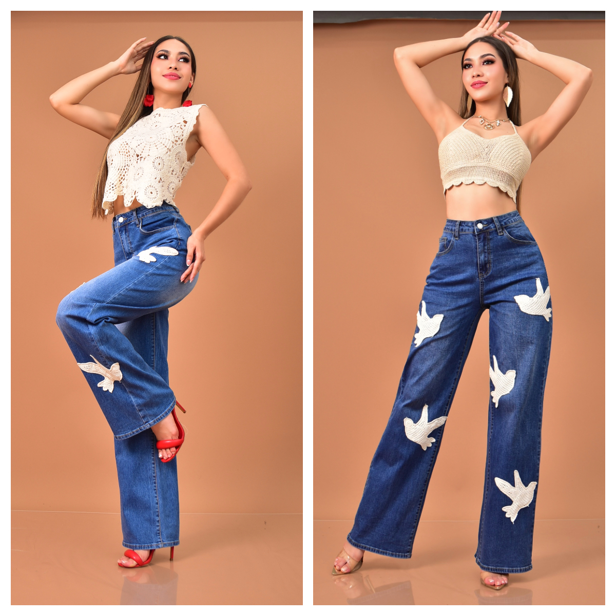 Jeans corte amplio tipo Wide Leg confeccionado en mezclilla suave semi stretch. Diseño moderno que destaca por sus aplicaciones bordadas en forma de ave que aportan un toque creativo y original. Bolsillos laterales y traseros funcionales. Cintura alta que estiliza la figura y favorece a todo tipo de cuerpo. Perfectos para elevar cualquier outfit.