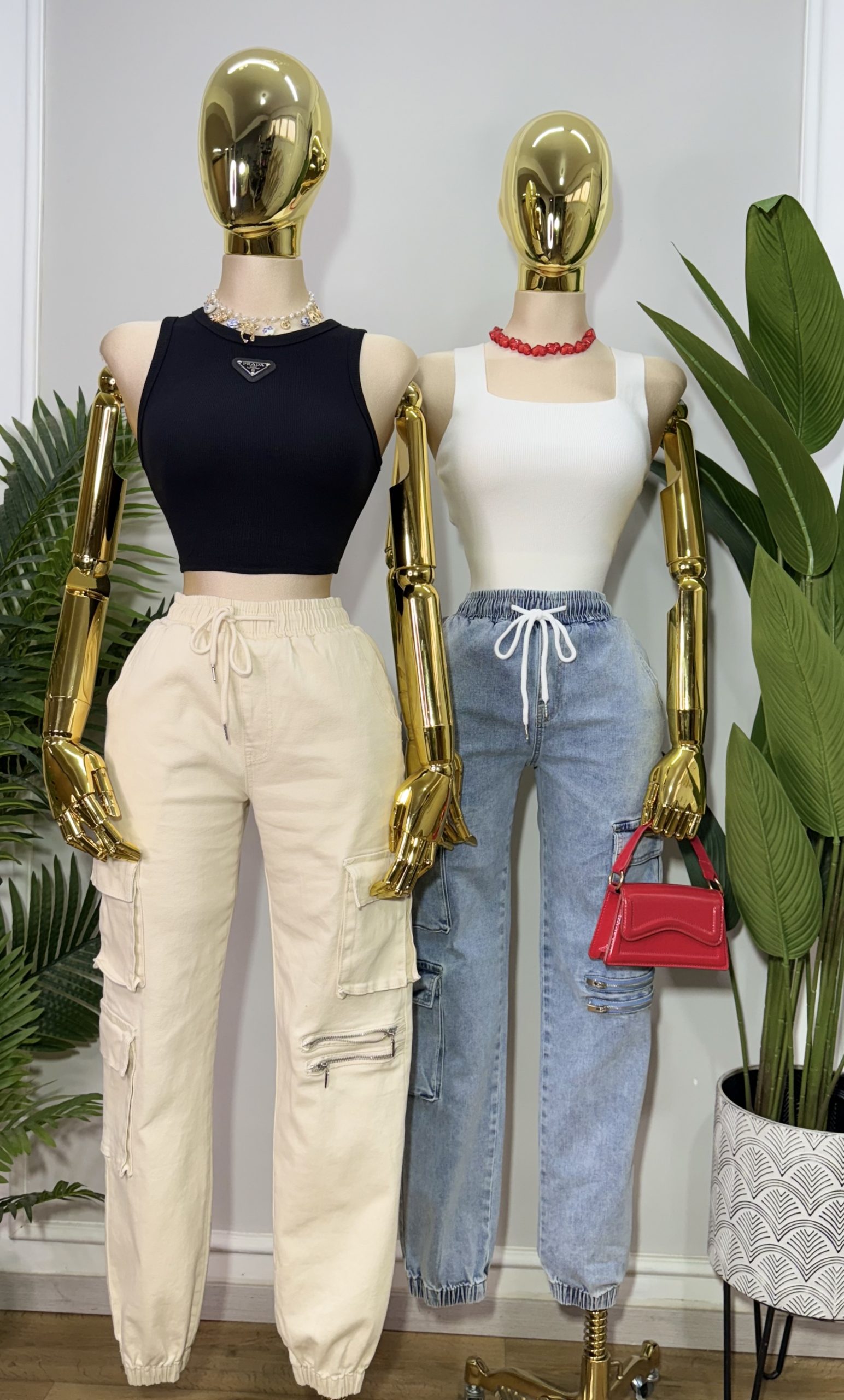 Jeans corte tipo jogger con elástico en tobillos y cintura con jareta para mejor ajuste. Confeccionado en mezclilla con stretch de excelente calidad. múltiples bolsillos funcionales y cierres metálicos en pierna. Estilo urbano y funcional, cómodo y versátil.