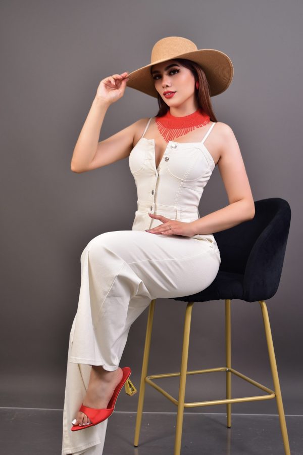 Mezclilla gruesa stretch (estira ), tirantes ajustables, botones de dorados, bolsas laterales y en gluteos.
