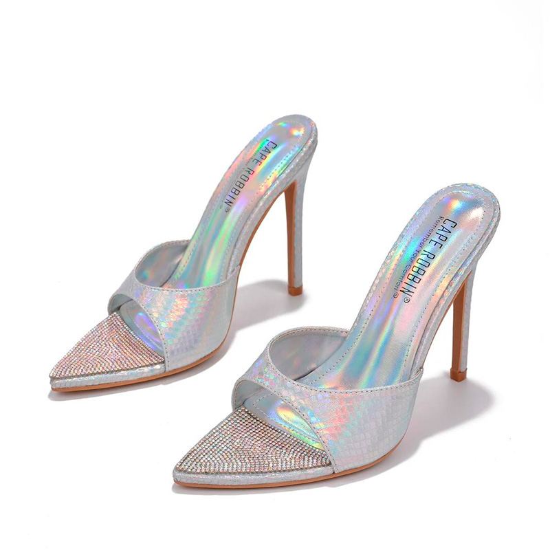 Punta abierta con incrustaciones de pedrería, efecto serpiente tornasol, plantilla ligeramente acolchada. Altura tacón : 11 cm