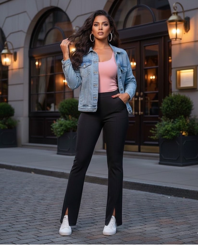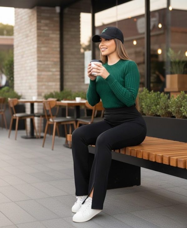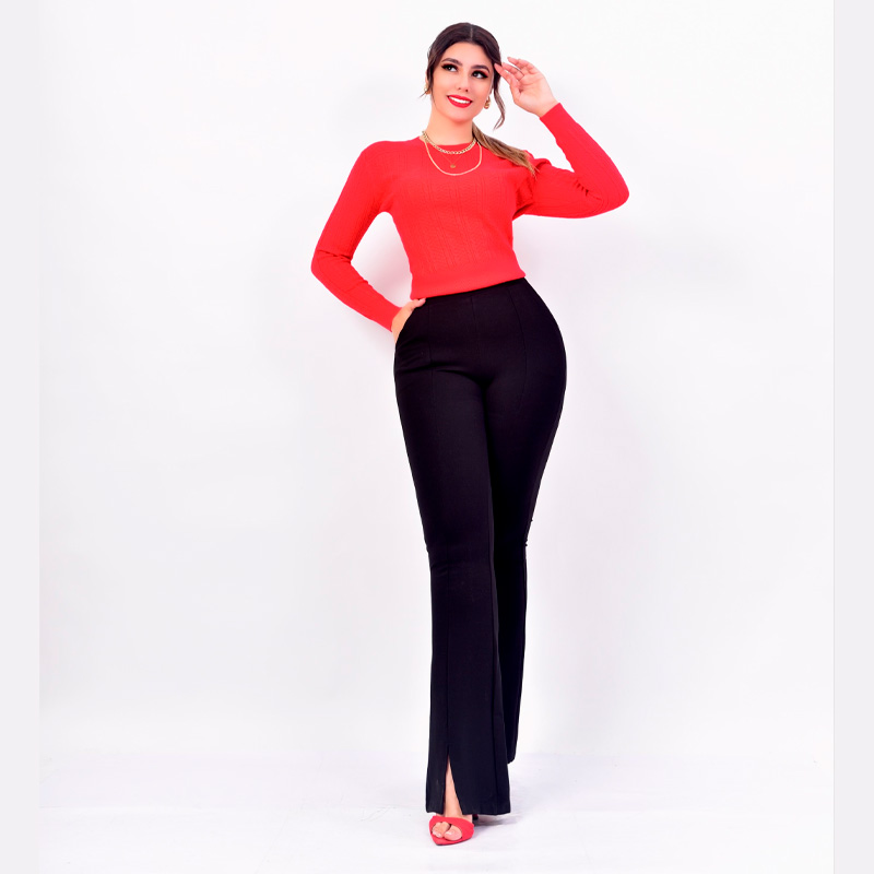 Leggins acampanado con aberturas frontales. Pinza en pliegues frontales. Stretch. Corte largo, la modelo mide 172 cm y usa tacones.