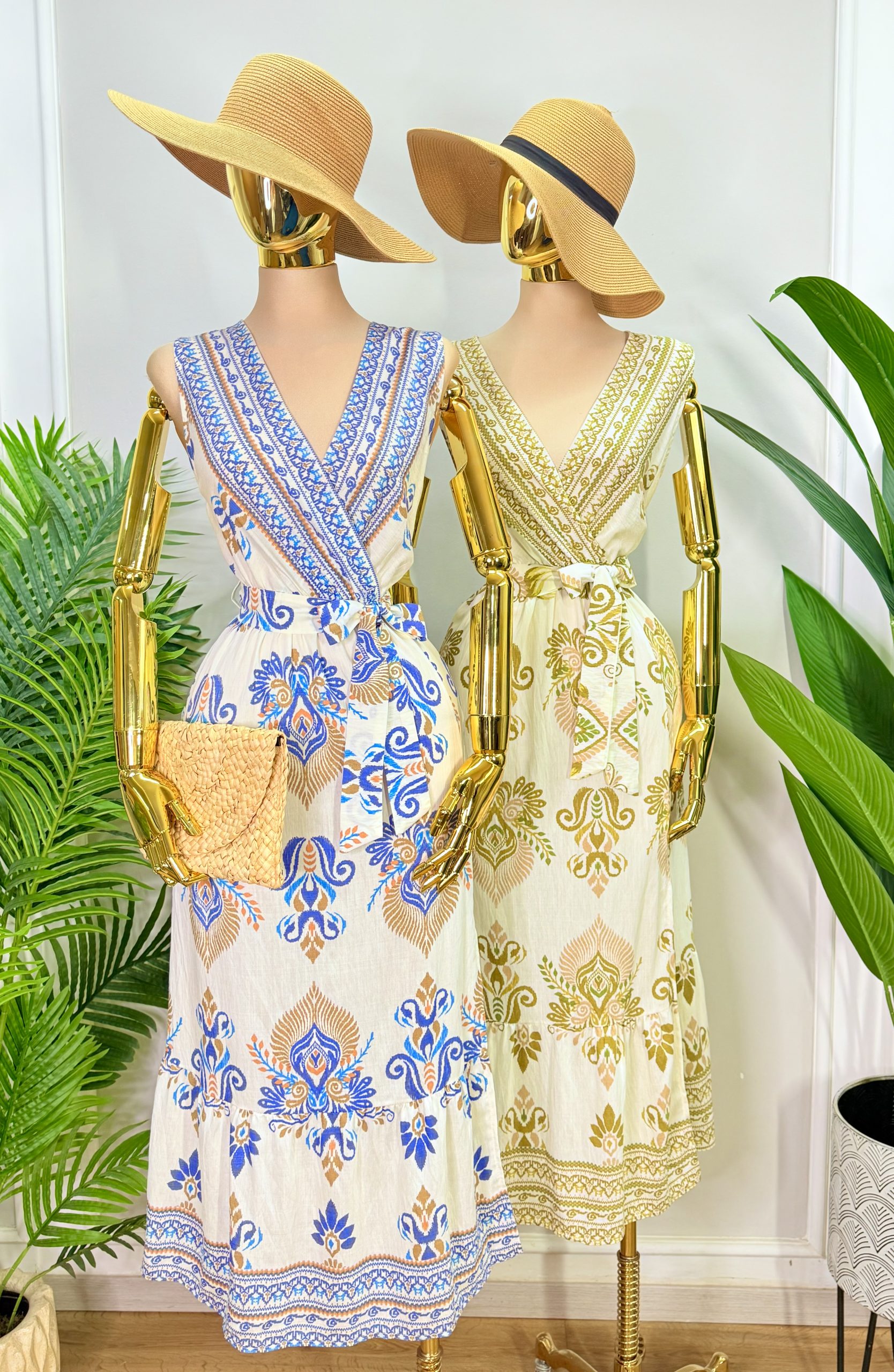 Maxivestido sin mangas con escote en “V” cruzado y cinta ajustable para definir la cintura. Elástico en cintura y abertura en la parte baja de la falda. Elegante estampado floral con detalles decorativos tipo bordado en el escote. Bolsillos a los costados. Ligero y fresco. Tela de viscosa.