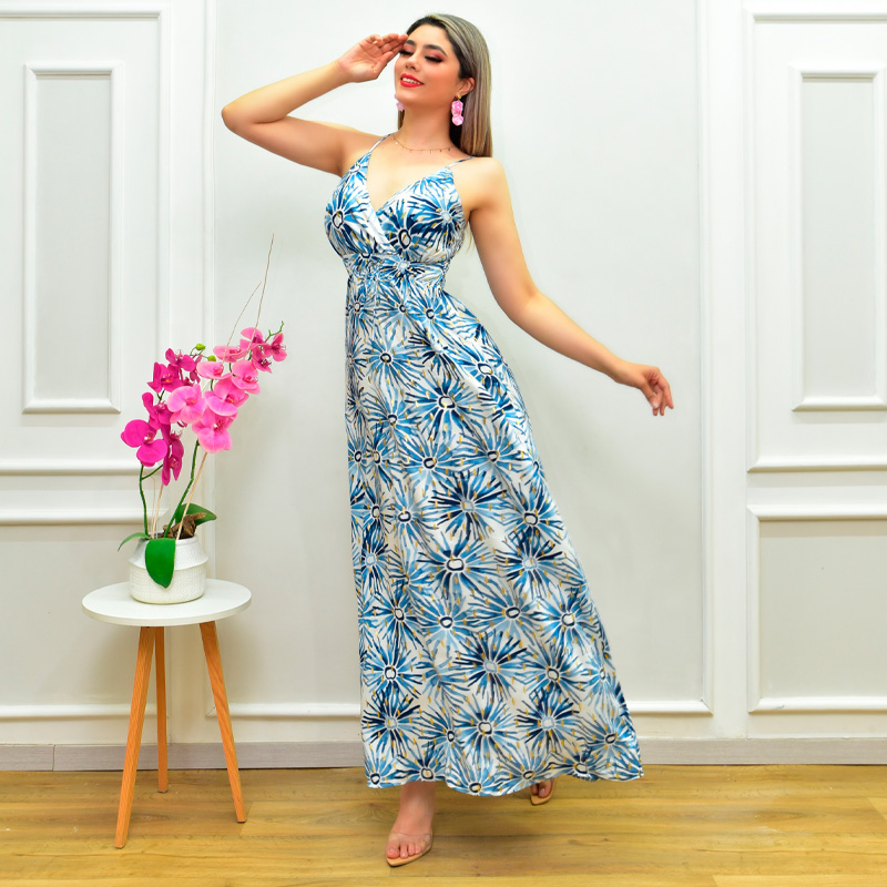 Maxivestido con estampado floral y vivos en dorado metalico. Tela super fresca (viscosa). Elástico corrugado en espalda. Tirantes ajustables. Jareta en cintura para ajustar.
