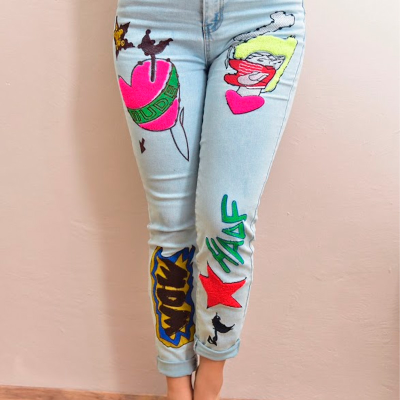 Jeans super trendy con estampados coloridos frontales. Corte MOM.
