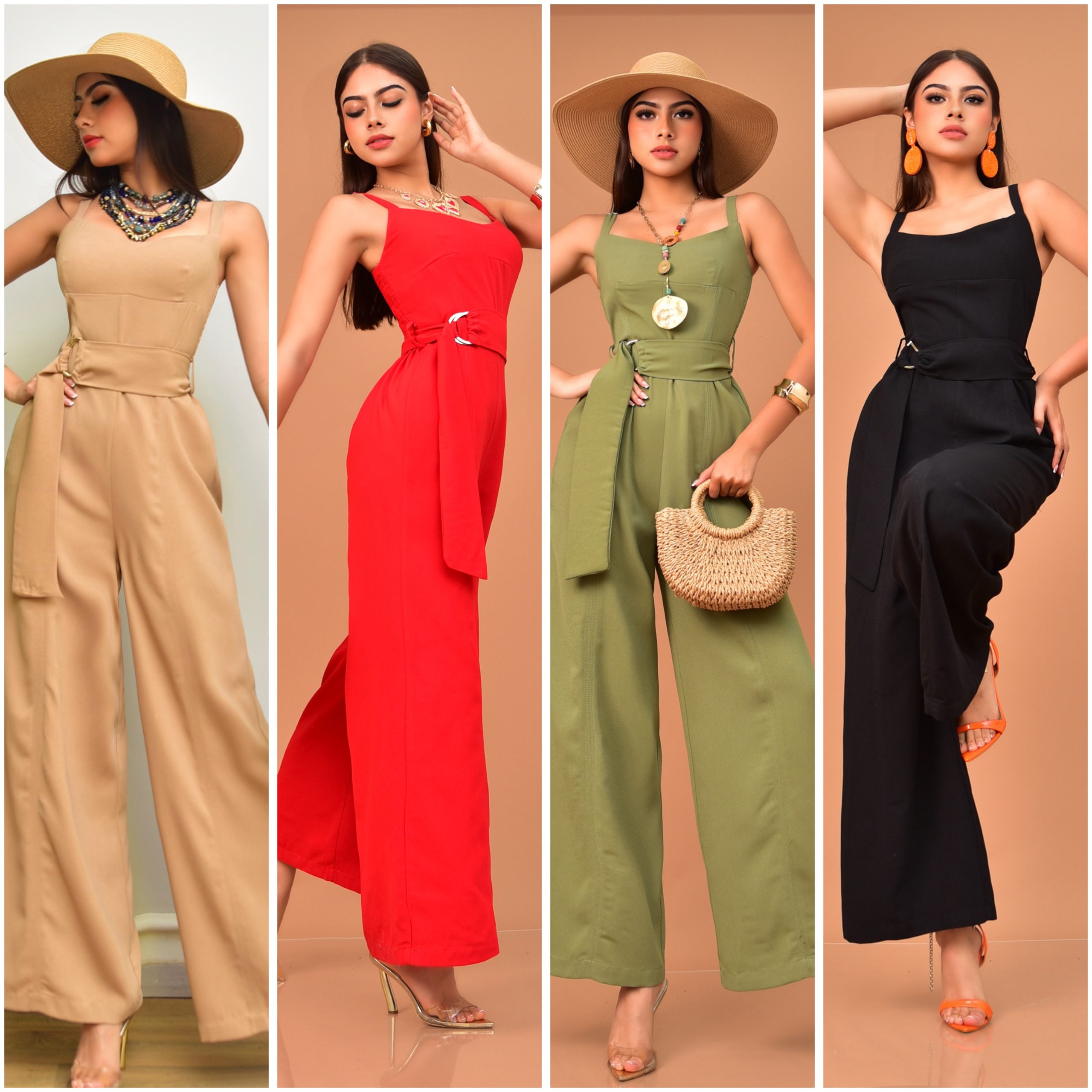 Precioso mono largo tipo palazzo sin mangas con tirantes delgados, elástico fruncido en la espalda y escote recto. Pantalón de pierna ancha; incluye cinturón del mismo material con hebilla, ideal para ajustar a la cintura y estilizar la figura.