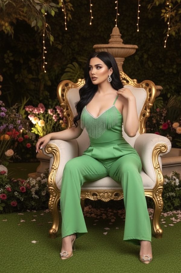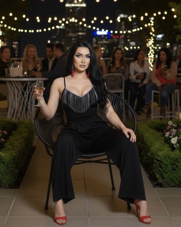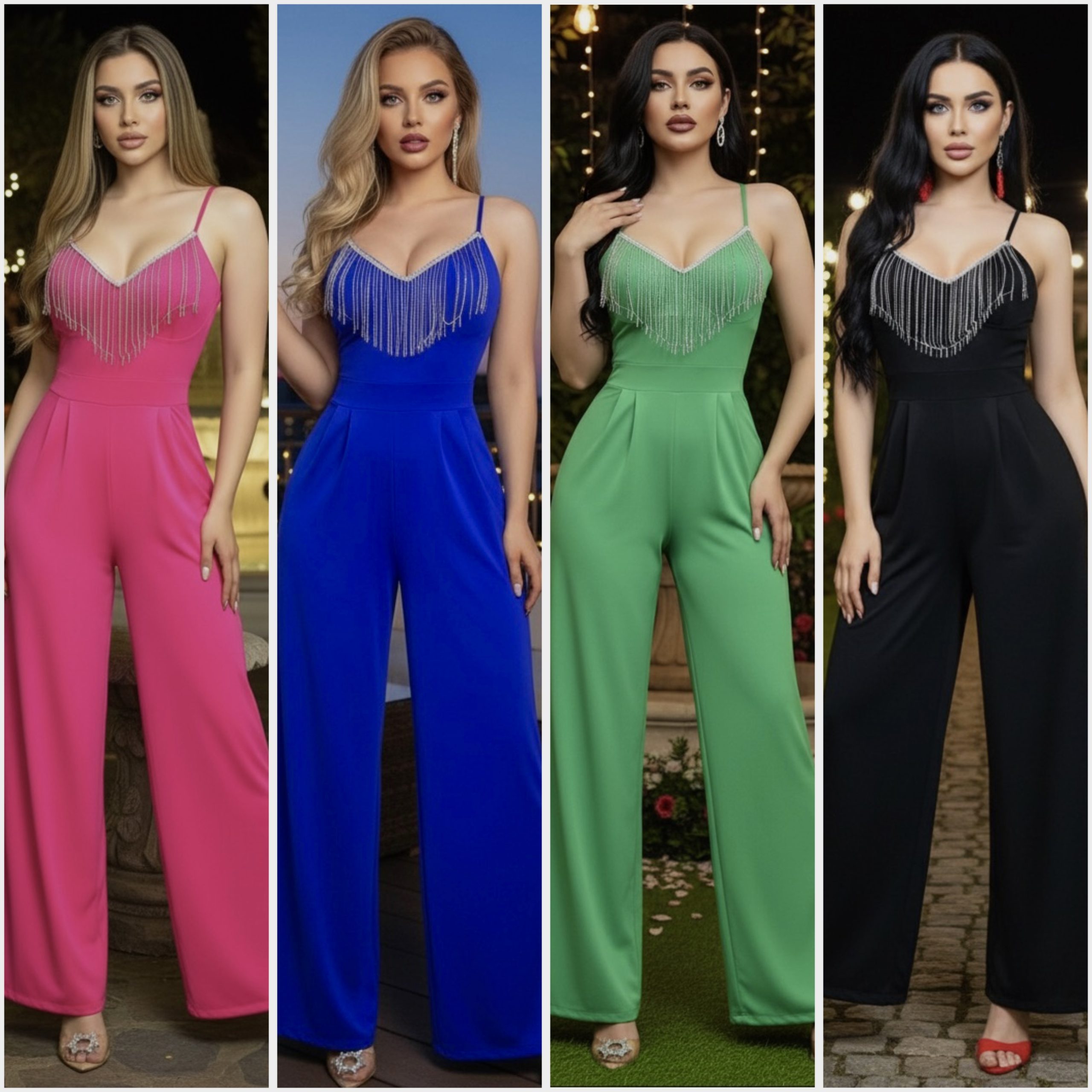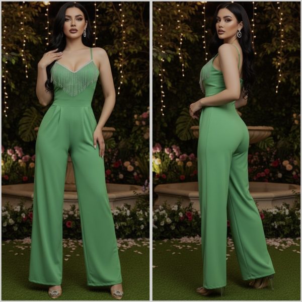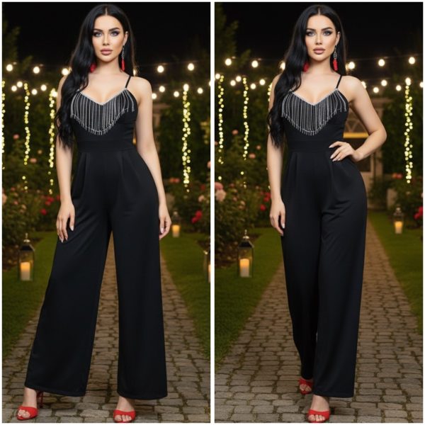 Palazzo liso con tirantes ajustables delgados. Escote en “V” adornado con tiras plateadas. Cierre invisible a un costado y elástico delgado en la espalda.