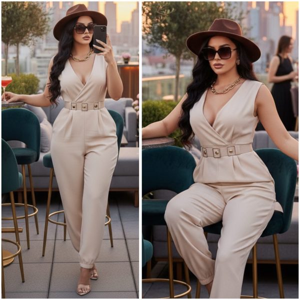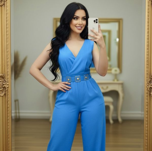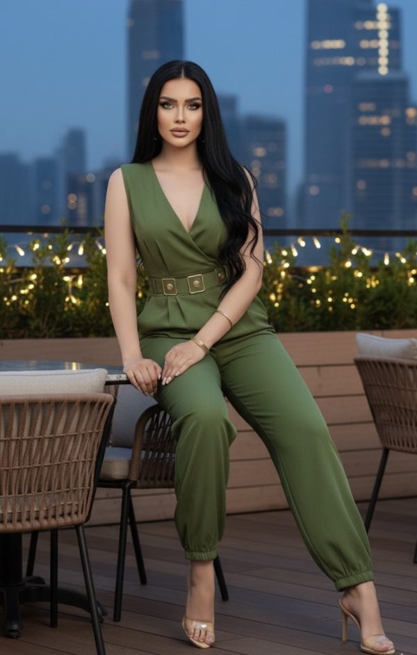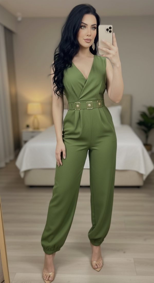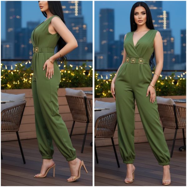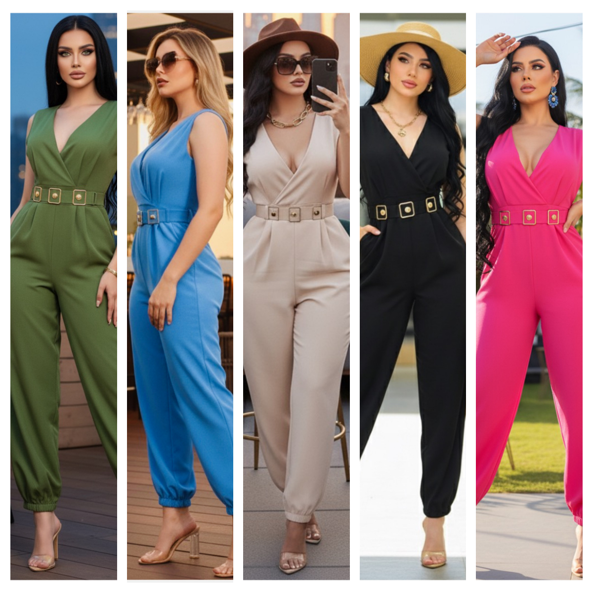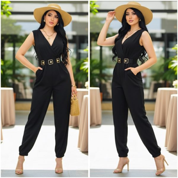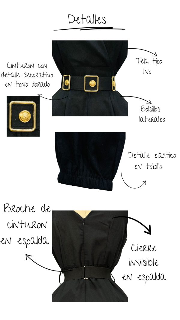 Palazzo corte cruzado, cierre invisible en espalda y elástico en tobillos, escote V con copas. Tela de lino, súper fresca. Incluye cinturón con elástico y detalles en dorado. Tela rígida.