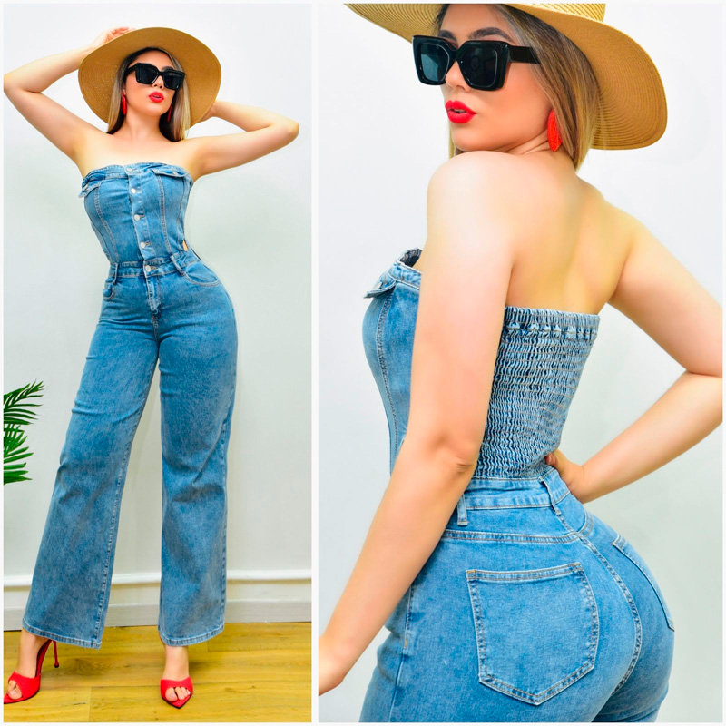 Palazzo de mezclilla strapless. Detalles cut out en cintura. Botones metálicos. Elástico fruncido en espalda. Corte acampanado. Banda de silicón antideslizante.
