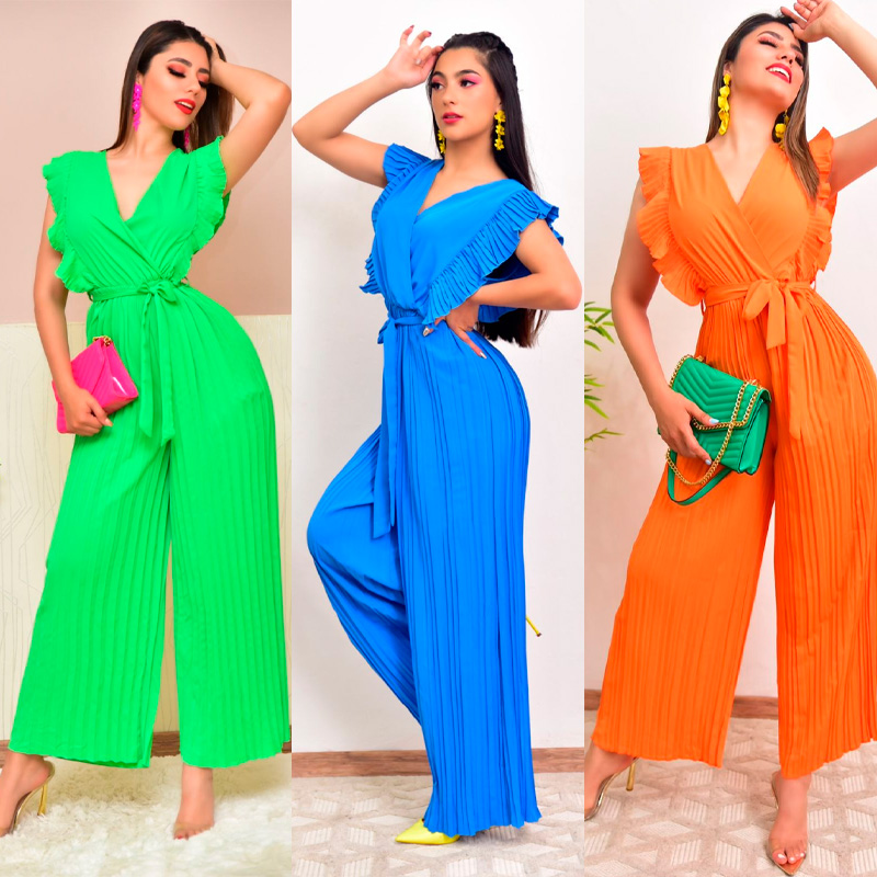 Corte cruzado en escote. Manga de olanes volante. Pantalón acampanado con plisado super elegante. Cinta en cintura que estiliza tu figura.