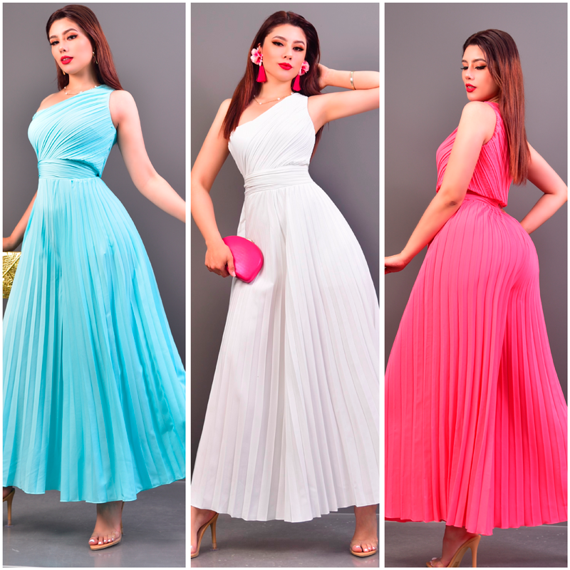 Palazzo elegante estilo oneshoulder. Efecto plisado diagonal en top y vertical en pantalón, Pretina plisada. Cierre invisible lateral. Forro de algodón en torso y a medio muslo.