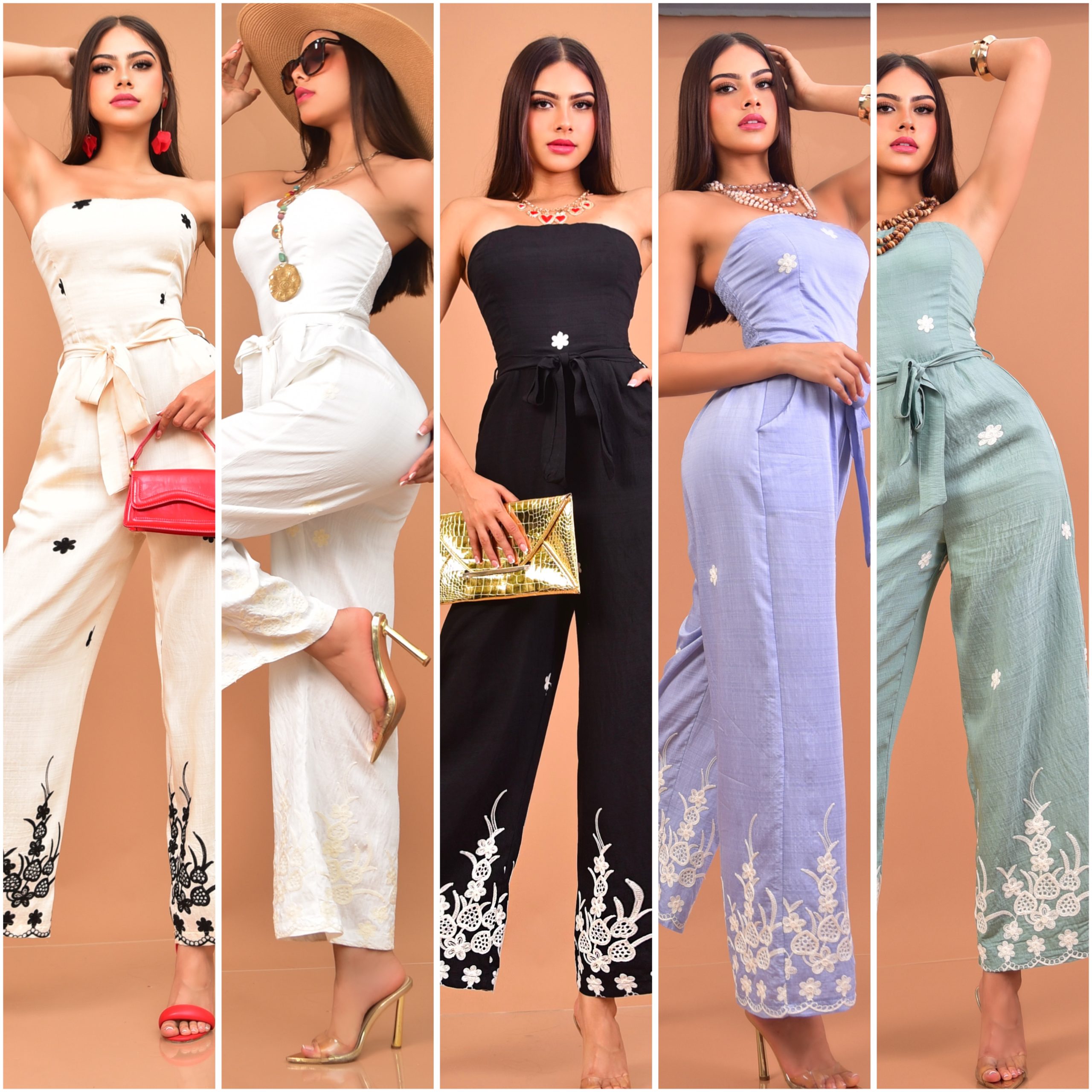 Palazzo strapless con cinturón de tela del mismo tono, ideal para resaltar la figura. Elástico fruncido en la espalda. Bolsas a los costados. Detalles bordados, con un diseño delicado que aporta un aire bohemio y delicado.