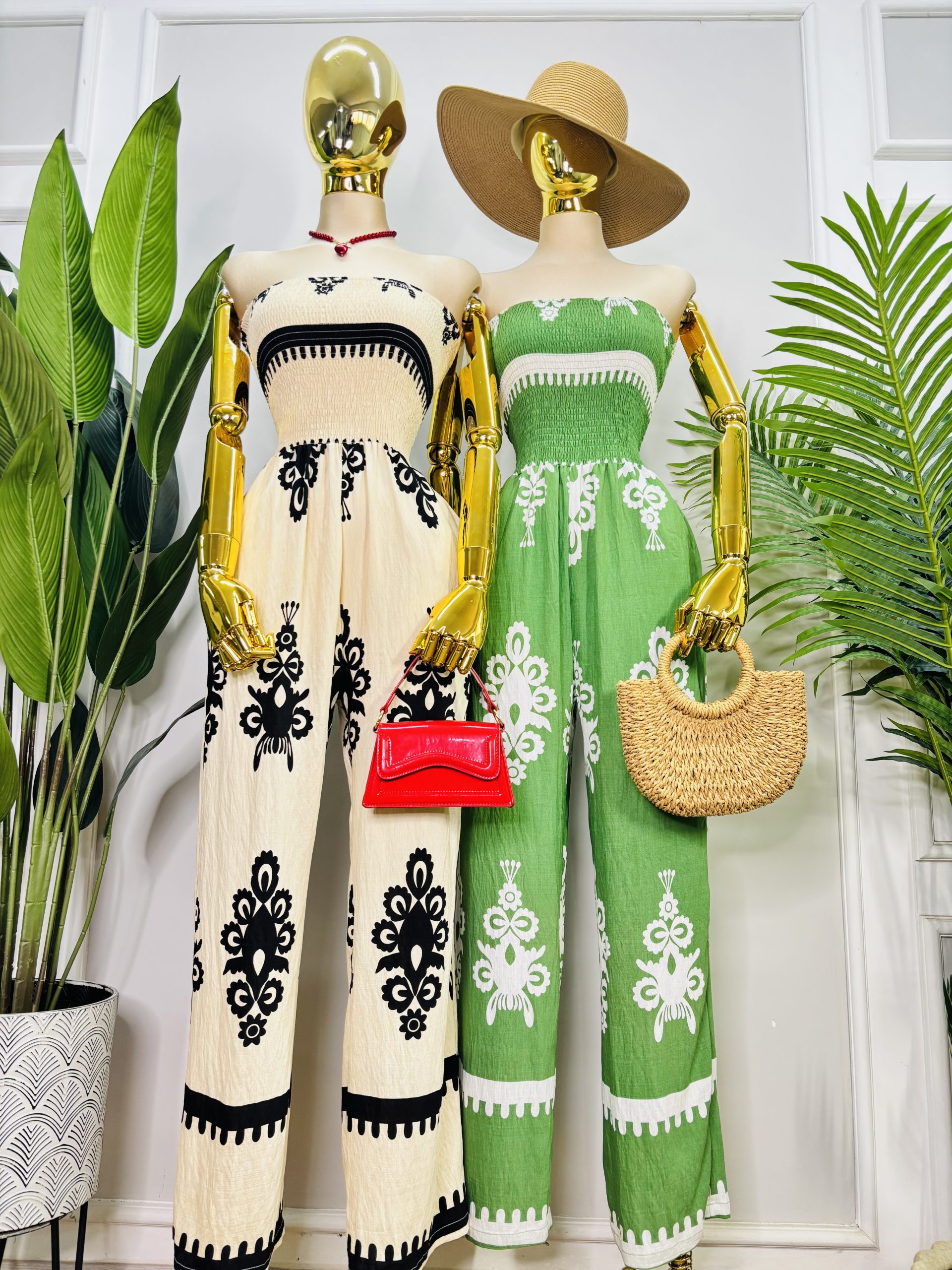 Palazzo con diseño strapless. Elástico fruncido en torso para un ajuste cómodo y favorecedor. Corte inferior amplio que estiliza la figura y aporta movimiento al caminar. Estampado étnico en contraste que realza el diseño. Bolsillos laterales. Ideal para días soleados, vacaciones o salidas casuales. ☀