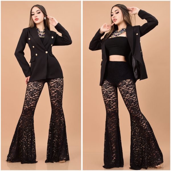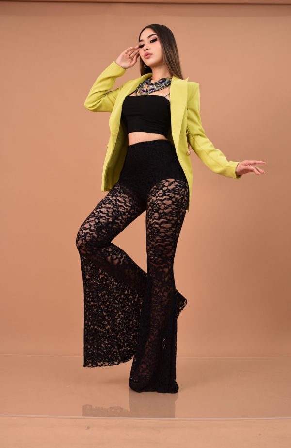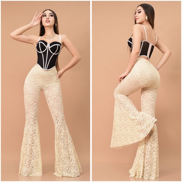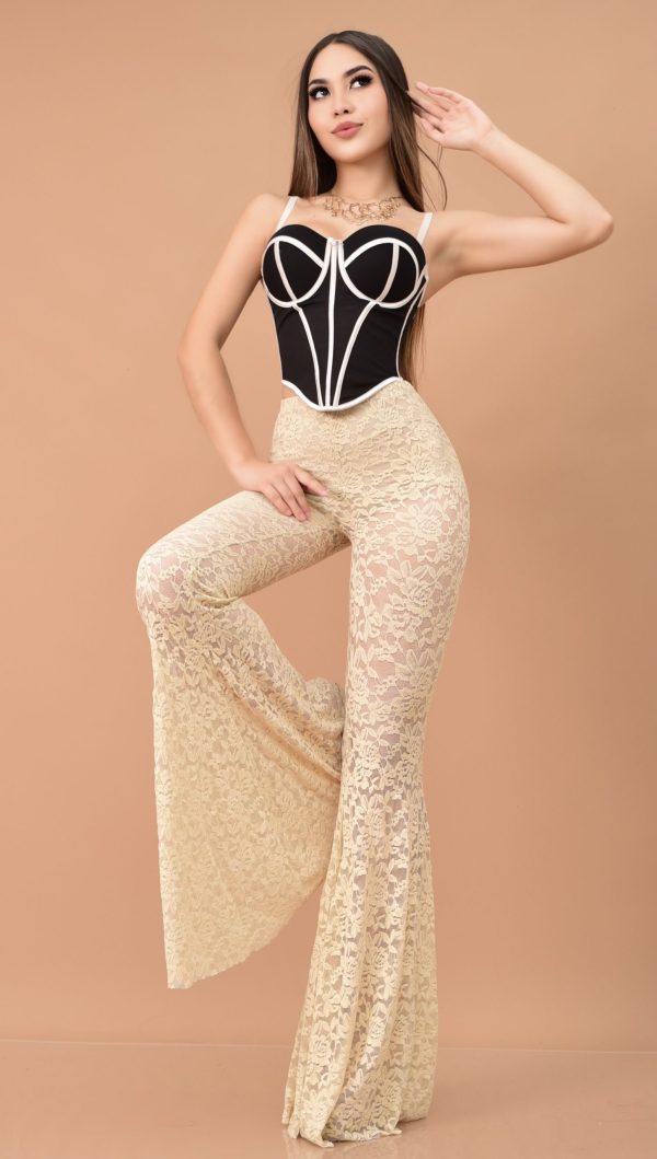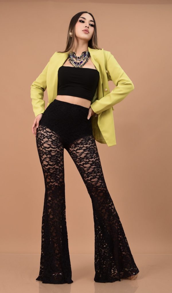 Pantalón de tiro alto confeccionado en delicado encaje floral stretch. Diseño ajustado en parte superior estiliza la figura. Corte con caída acampanada en la parte baja aporta un toque elegante y sofisticado. Pretina elástica, Incluye shorth de forro para mayor comodidad. Perfecto para looks de noche, eventos especiales o looks modernos y atrevidos. 💖
