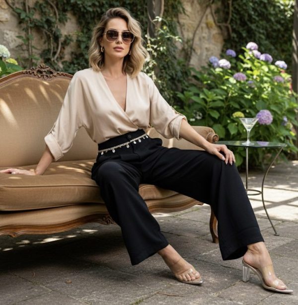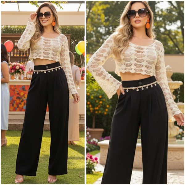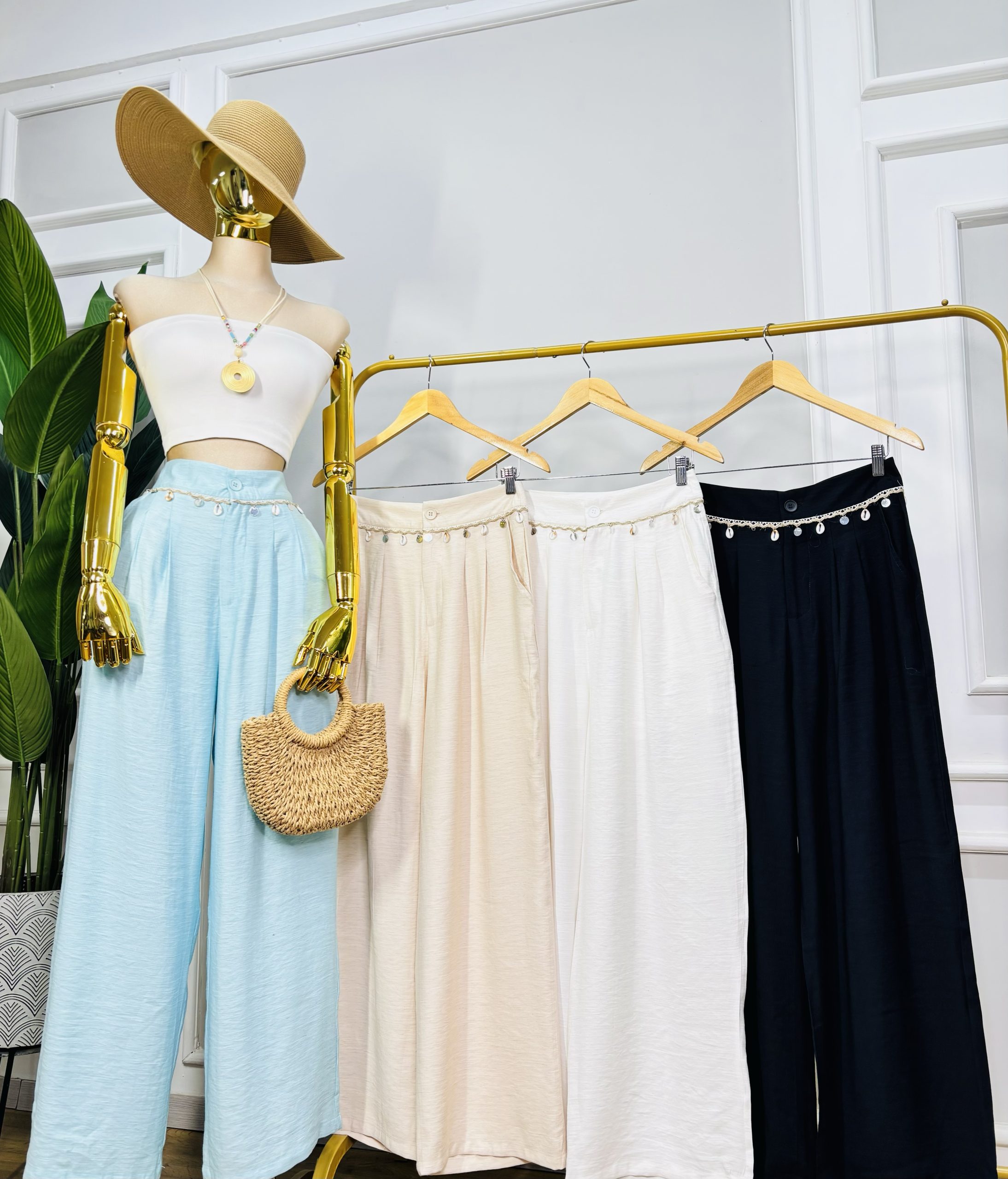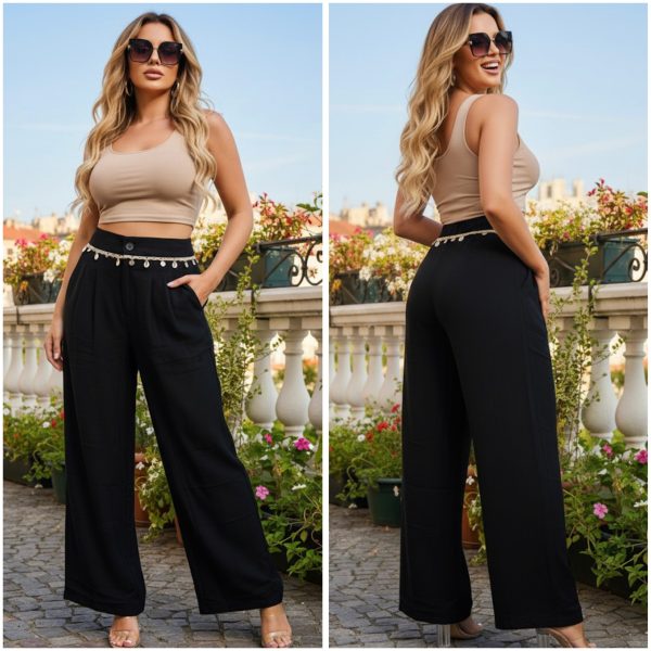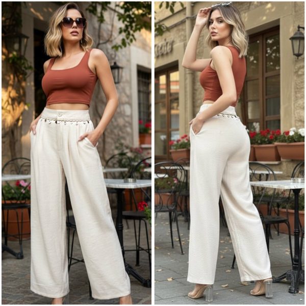 Pantalón de tiro alto con corte amplio, confeccionado en tela fresca y ligera. Pinzas frontales que estilizan la figura. Detalle en cinturilla con trenza, conchas marinas y apliques metálicos decorativos. Que aporta un toque artesanal y natural a su diseño. Bolsillos laterales funcionales.