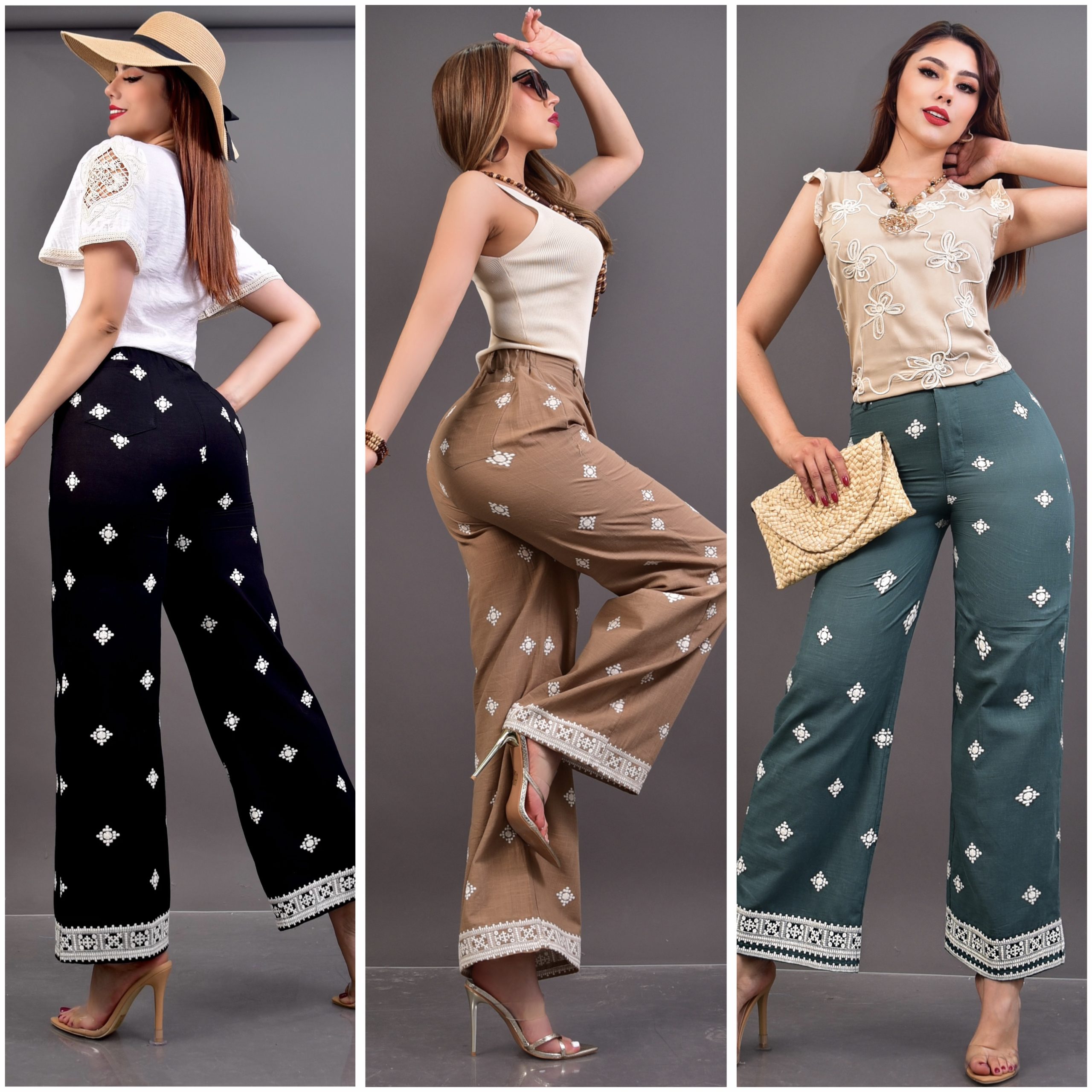 Pantalón bordado de corte recto y de tiro alto. Bordado más detallado y llamativo en el dobladillo del pantalón, dándole un acabado sofisticado. Elástico y bolsillos en la parte trasera del pantalón.