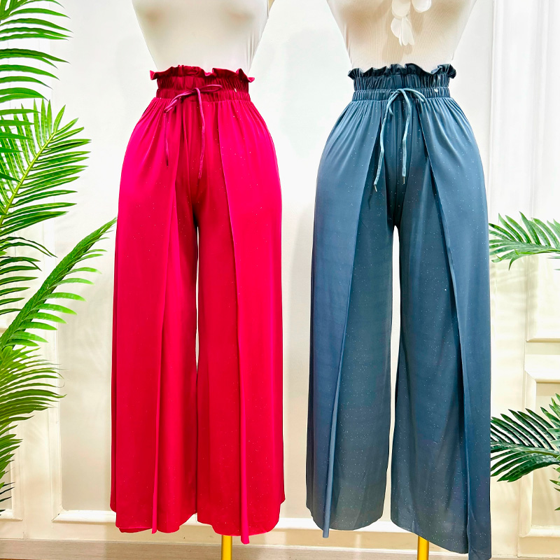 Pantalón efecto envolvente con brillos, elástico en cintura y cordón para ajustar. Stretch.