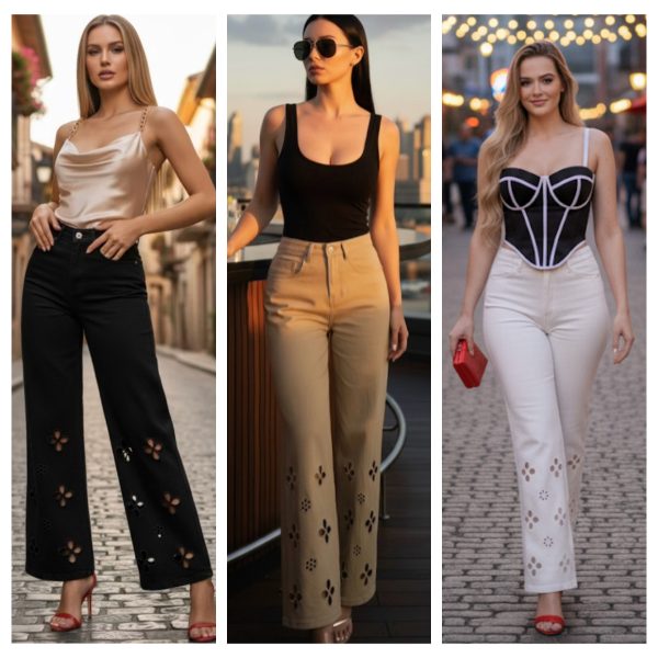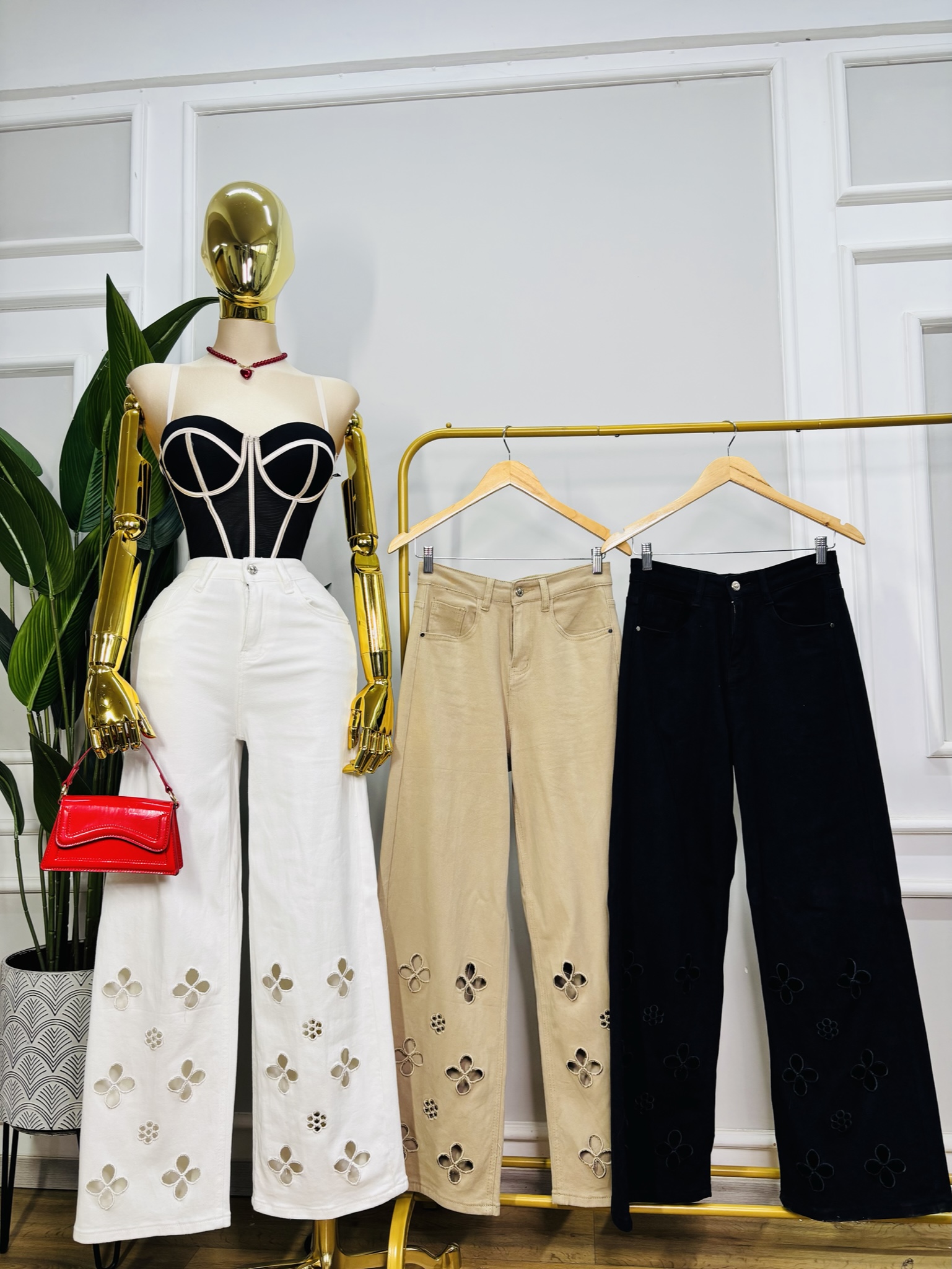 Pantalón con corte wide leg y tiro que estiliza la figura. Detalle de flores caladas en el bajo que le dan un toque único y artesanal. Confeccionado en mezclilla suave semi stretch para un ajuste cómodo. 🌿 ✨