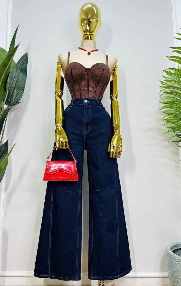 Pantalón de mezclilla, tiro alto, corte recto amplio con silueta favorecedora que estiliza la figura. Diseño con costuras marcadas que alargan visualmente las piernas. bolsillos delanterios y traseros funcionales. Un básico sofisticado que combina con todo.