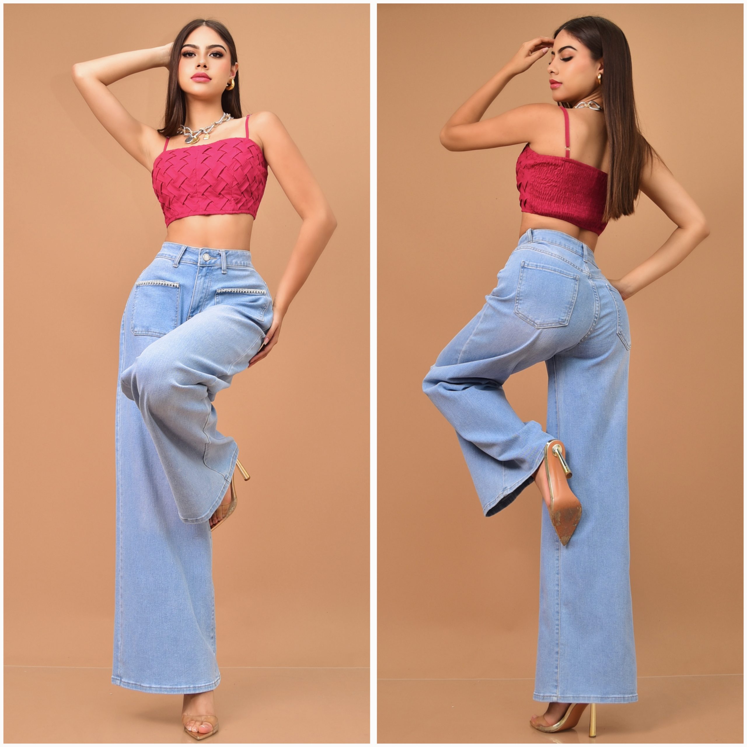 Pantalón denim de corte ancho y tiro alto, se ajusta a la cintura, resaltando la silueta. Bolsillos delanteros visibles con pequeño detalle decorativo tipo cadena en el borde superior. Bolsillos traseros. Estilo casual y moderno.