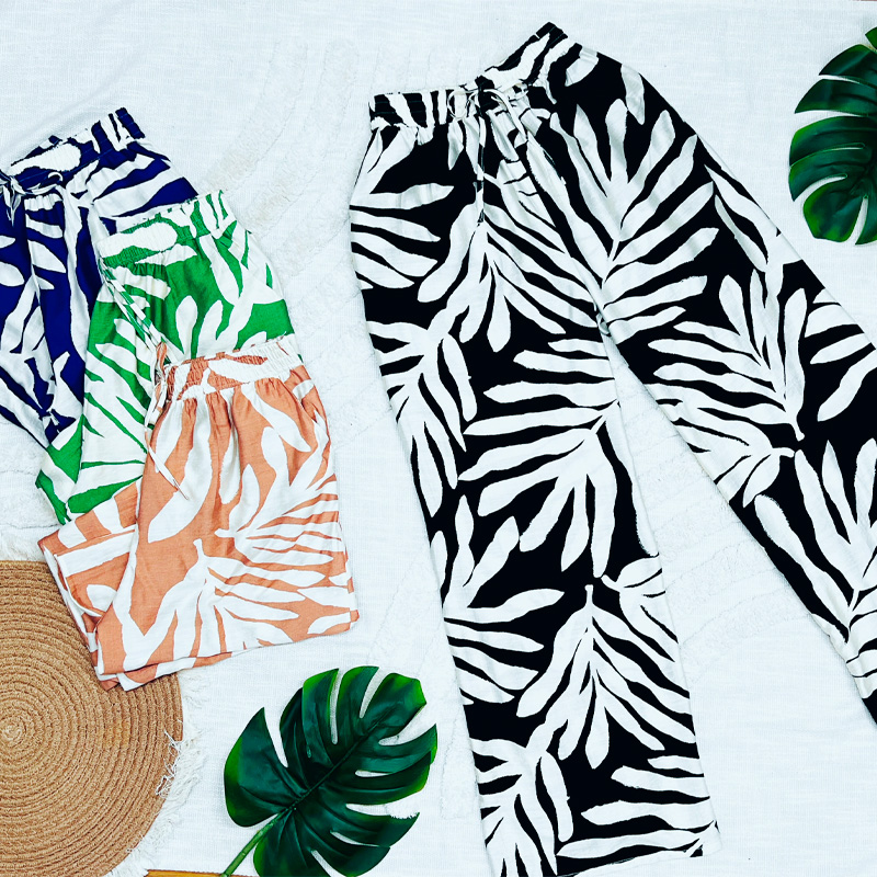 Pantalón fresco corte recto, estilo veraniego. Estampado playero, elástico en cintura y jaretas decorativas. Bolsillos laterales. 📌 Corte fiel a la talla IMPORTACION CALIDAD 💎💎💎💎💎💎💎💎