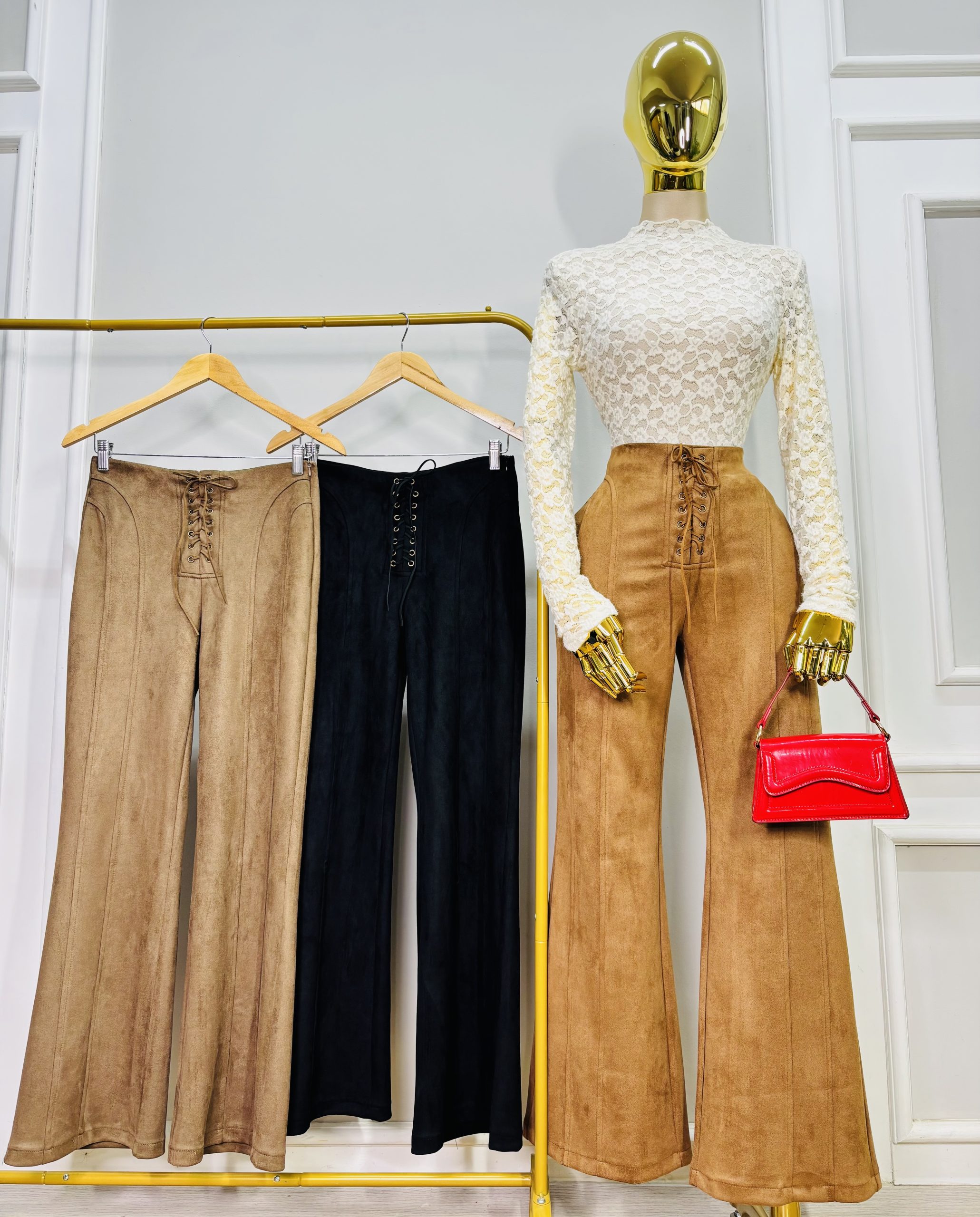 Pantalón estilo flare. Confeccionado gamuza stretch suave al tacto que aporta un acabado elegante y sofisticado. Tiro alto, que estiliza la figura y resalta la cintura gracias a su detalle de ajuste con cordón frontal, que añade un aire chic y moderno. Cierre invisible lateral. Una prenda versátil y en tendencia, ideal para looks boho, románticos o con un toque retro. 💕