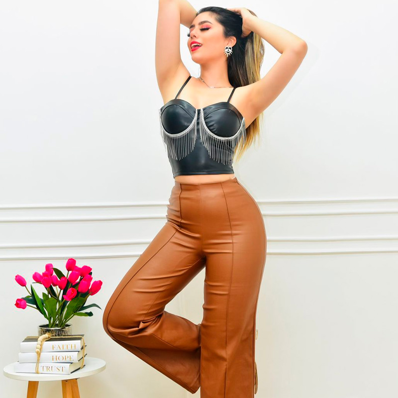 Pantalón corte flare. Vinipiel stretch con pinzas en glúteos. Cierre Invisible lateral.