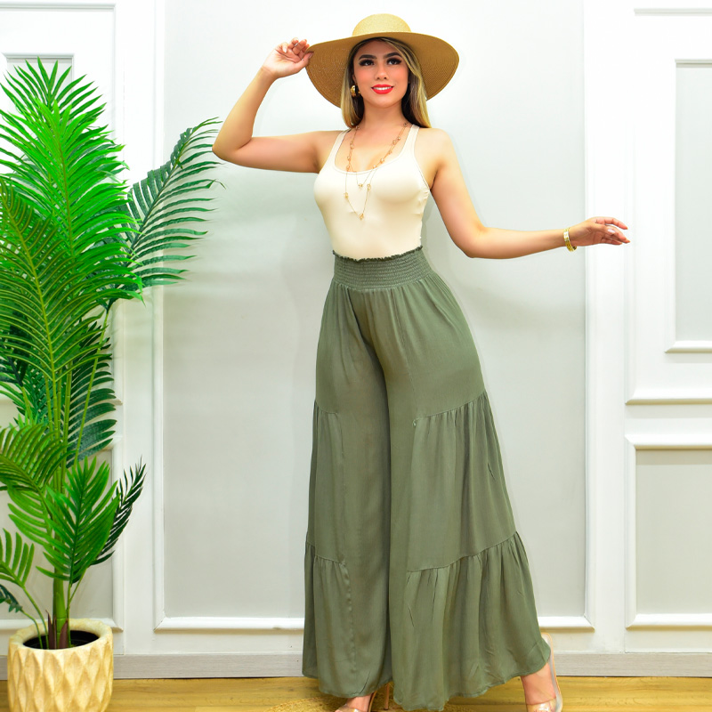 Pantalón liso, de pierna súper ancha tipo falda. Elástico fruncido en cintura. Diseño súper fresco.