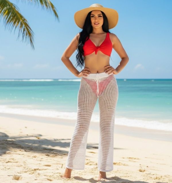 Pantalón tejido de punto de ganchillo, cordón en cintura para ajustar. Diseño de red.