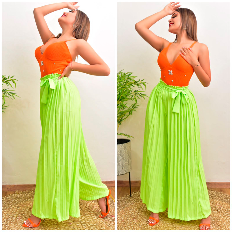 Increíble corte alto de este pantalón. Detalle de tableado lo que le da un efecto amplio. Cinta ajustable que puede usarse como moño. Con presillas para cinta. Elástico en cintura.