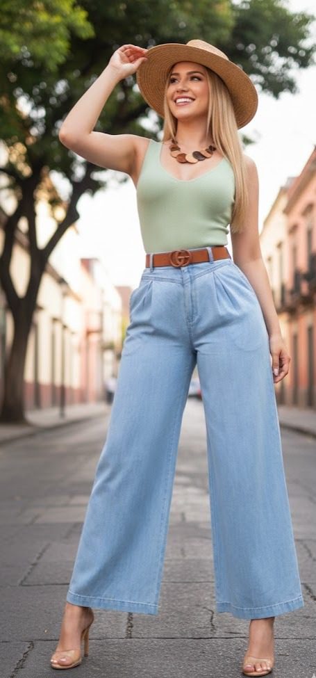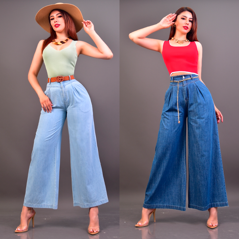 Pantalones primaverales de pierna ancha. Pretina ancha. Bolsillos laterales y solapa de bolsillo aparente en parte trasera. Trabillas para cinturón. Tela rígida.