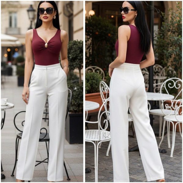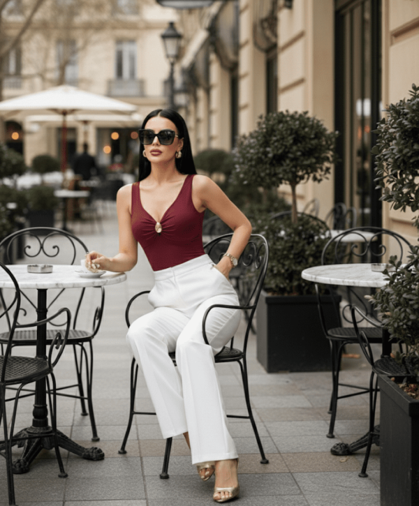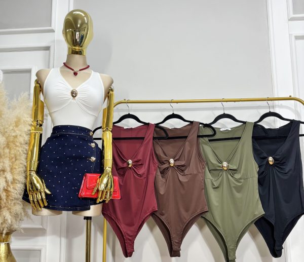 Escote en V con fruncido central que favorece el busto. Diseño con brocehe metálico frontal que aporta un detalle elegante.