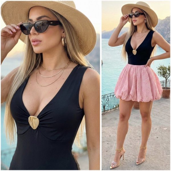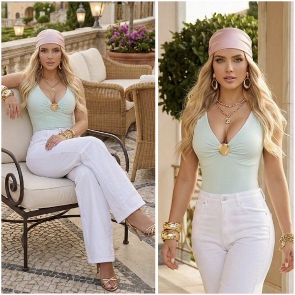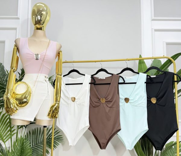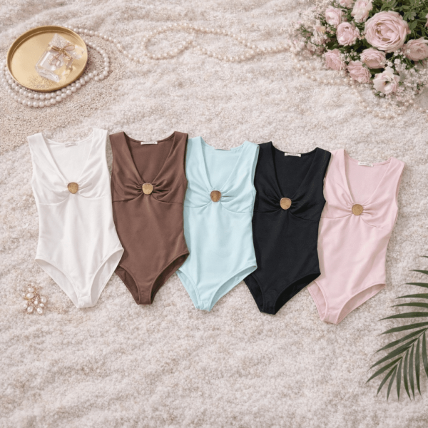 Escote profundo en “V” que realza el busto y detalle dorado.