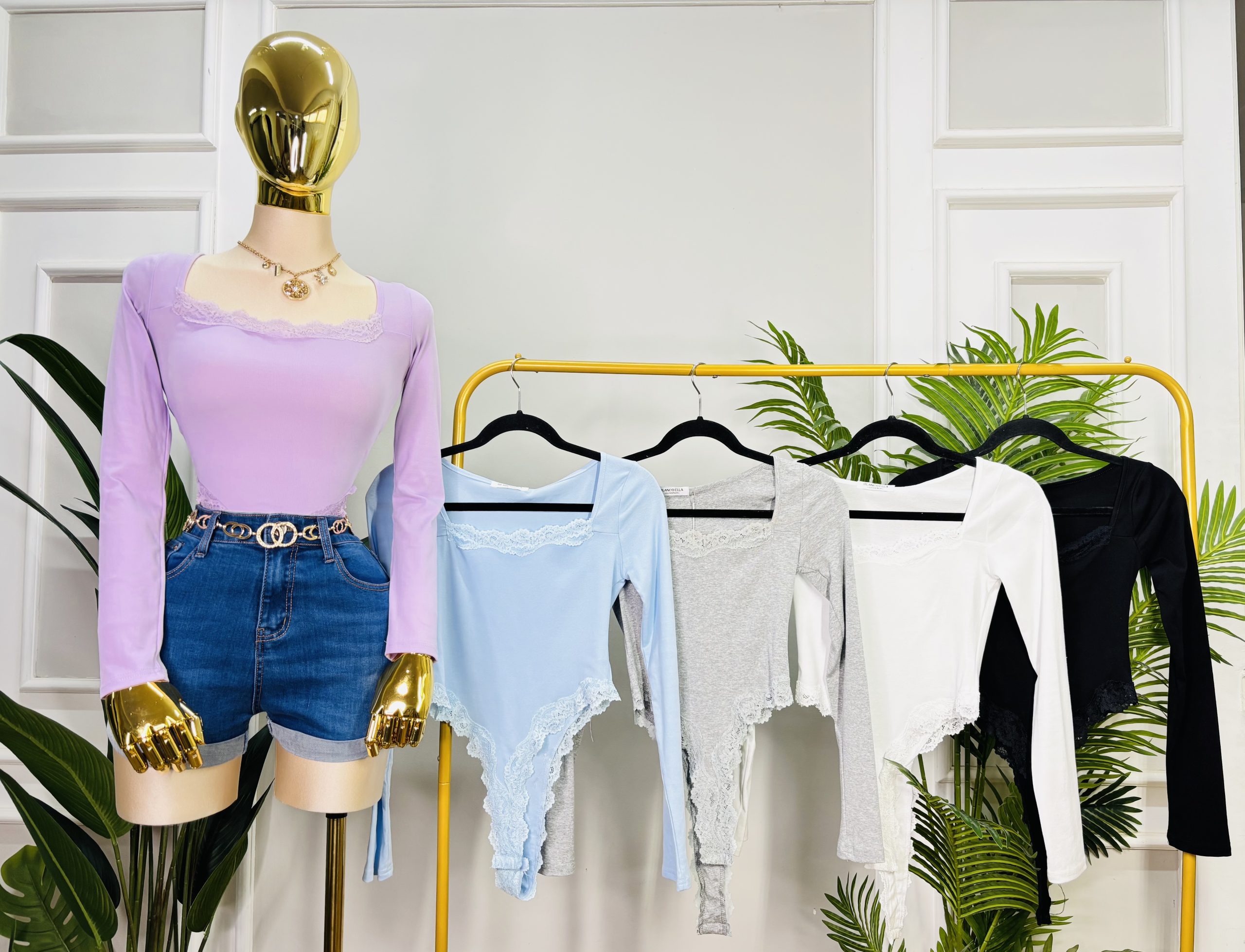 Pantiblusa de manga larga. Escote cuadrado con encaje que resalta el cuello y busto con elegancia. Confeccionado en algodón suave y elástico que se adapta perfectamente al cuerpo. Encaje parte inferior perfecto para lucir con pantalones tiro bajo y resaltar las caderas. Ajuste con broche. Ideal para looks casuales con un toque femenino y sexy.