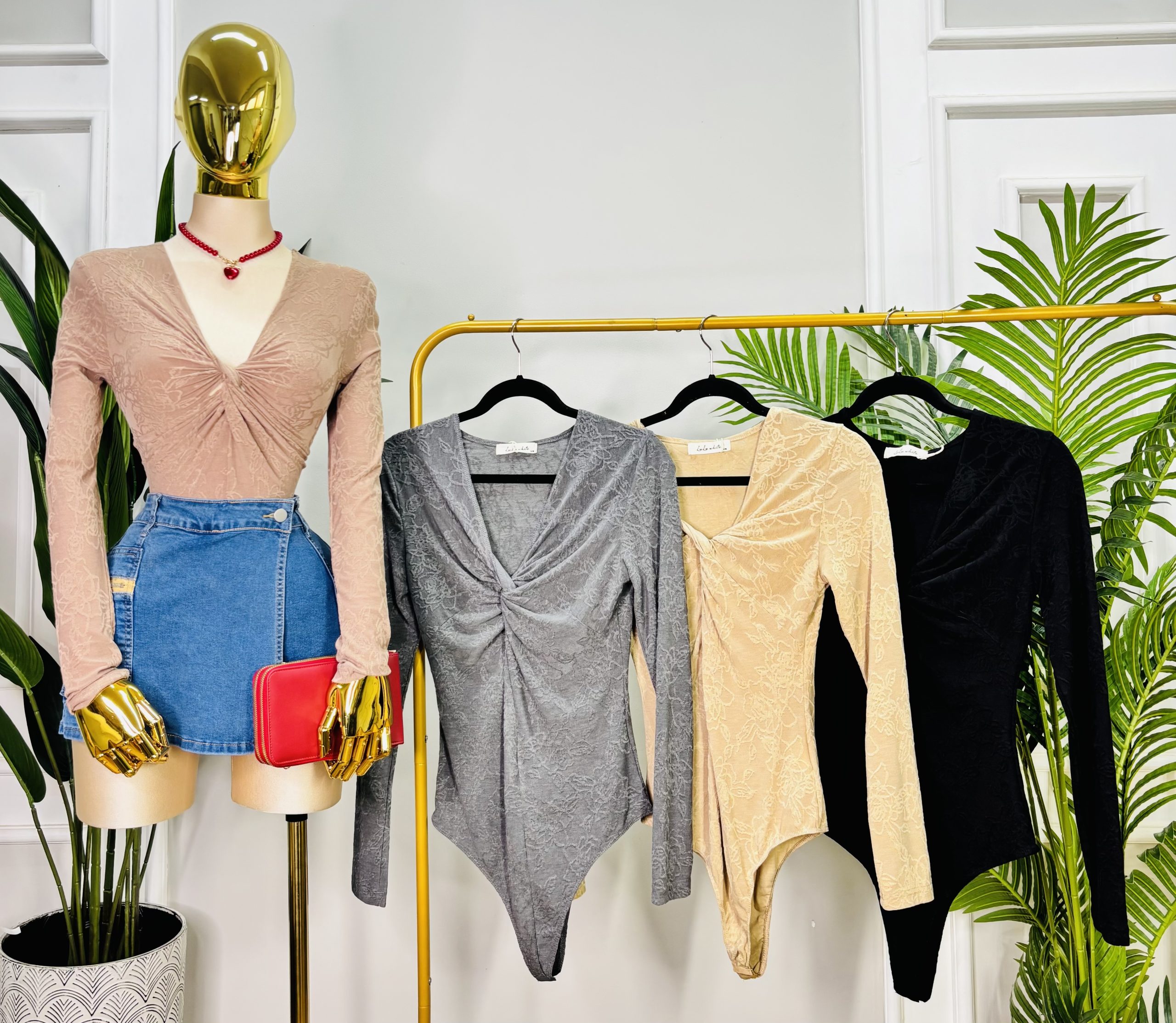 Pantiblusa elegante de manga larga en elástica con delicado patrón floral en relieve. Diseño con escote en V y nudo frontal que realza la figura brindando un toque elegante y femenino. Ajuste ceñido que estiliza silueta. Ajuste con ganchos. Prenda versátil ideal para combinar con todo. 🥰