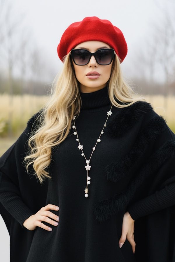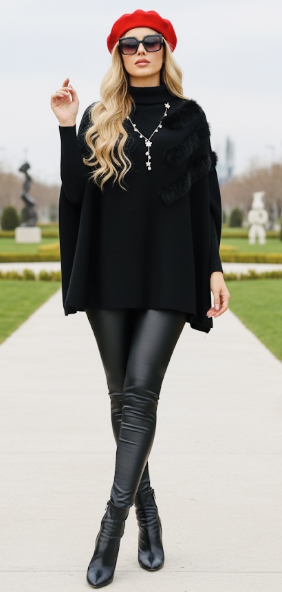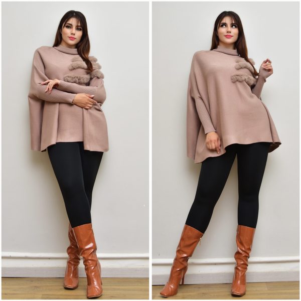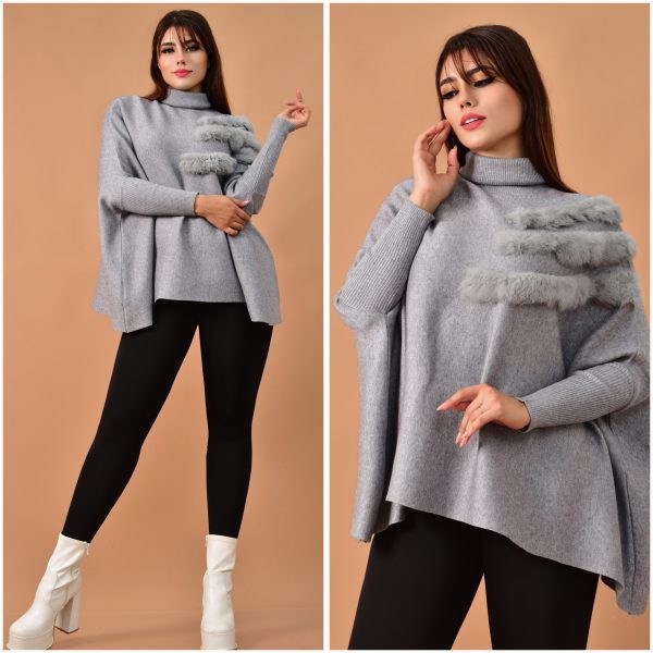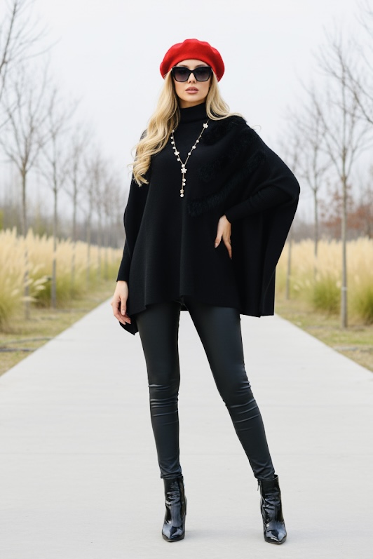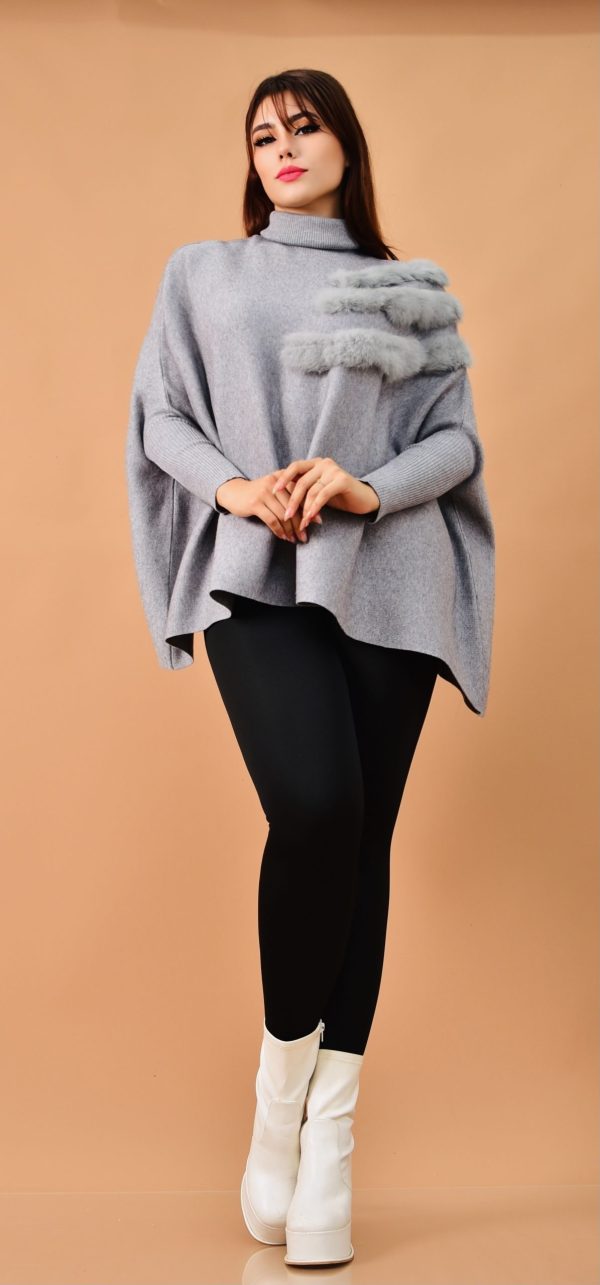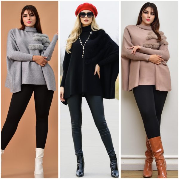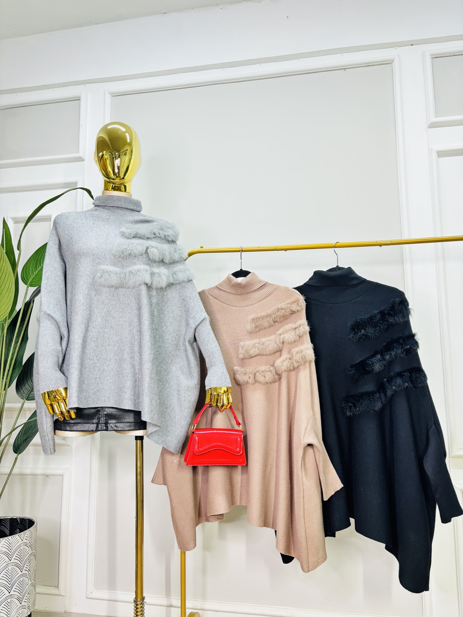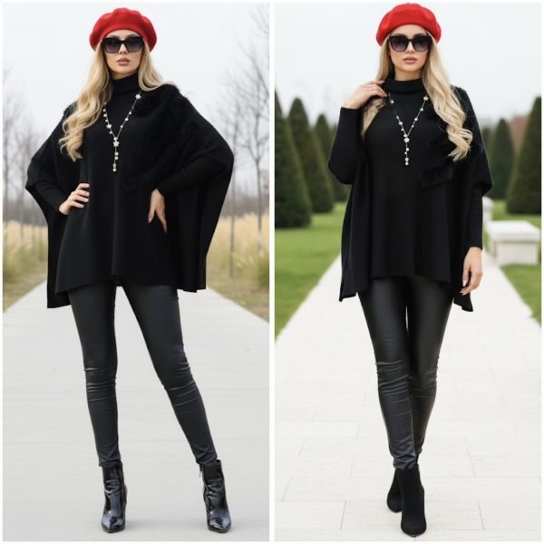 Suéter tipo poncho de manga amplia con cuello alto acanalado. Diseño moderno en tejido con stretch, suave y acogedor. Aplicaciones de peluche en el frente, que le dan un toque chic y sofisticado. Perfecto para lucir con estilo en días fríos. 🌨❄