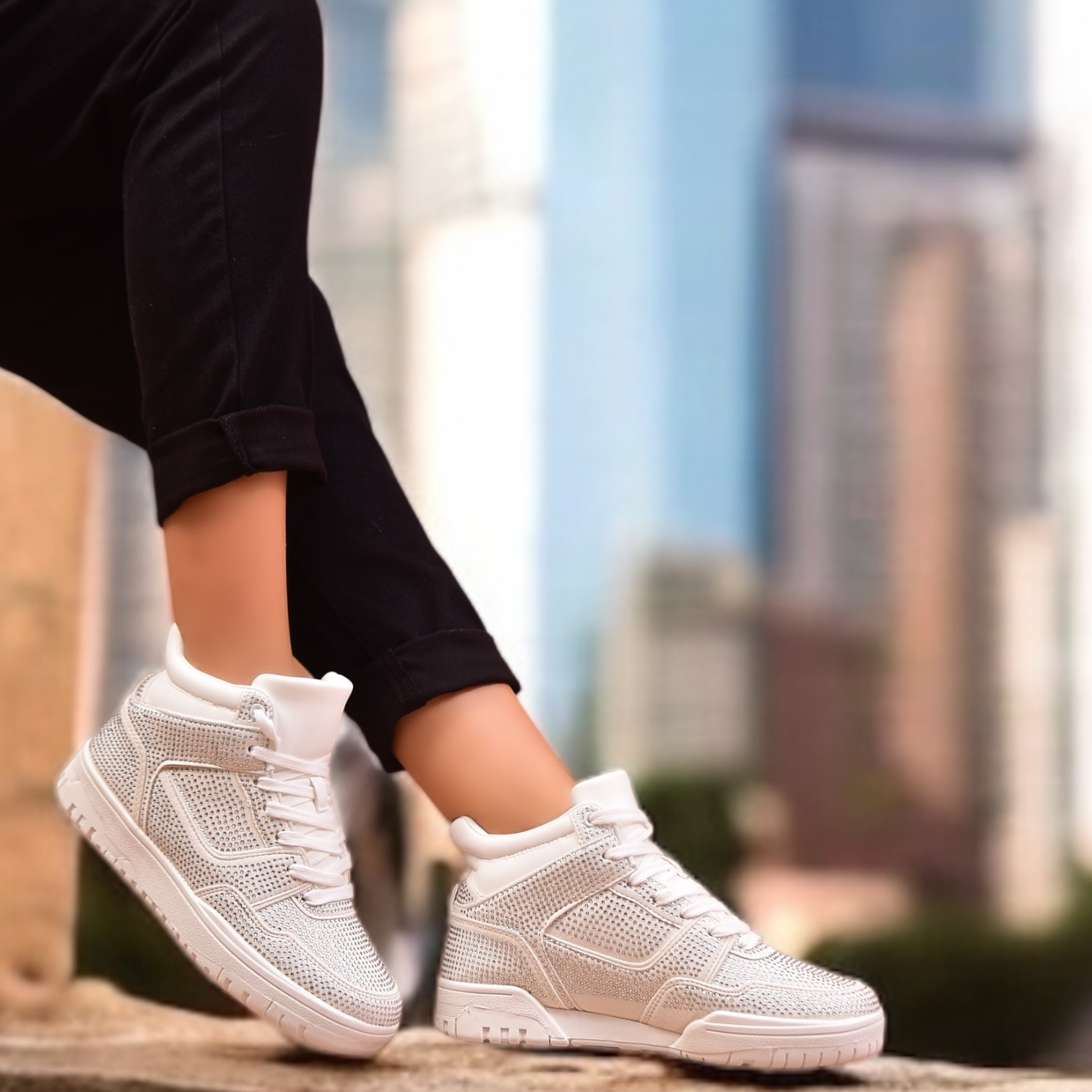 Tenis deportivos tipo bota. decorados con aplicaciones de pedrería ✨. Lengüeta acolchada para mayor comodidad. Suela es robusta y antideslizante. Perfectos para destacar en outfits urbanos, casuales o incluso para darle un giro chic a un look deportivo.