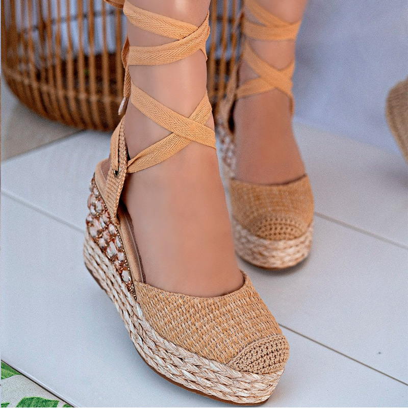 Sandalia de plataforma, detalles de rafia en plataforma, pedrería en tacón. Efecto tejido en unta y talón, cordones para usar estilo griego. Tacón 10 cm.