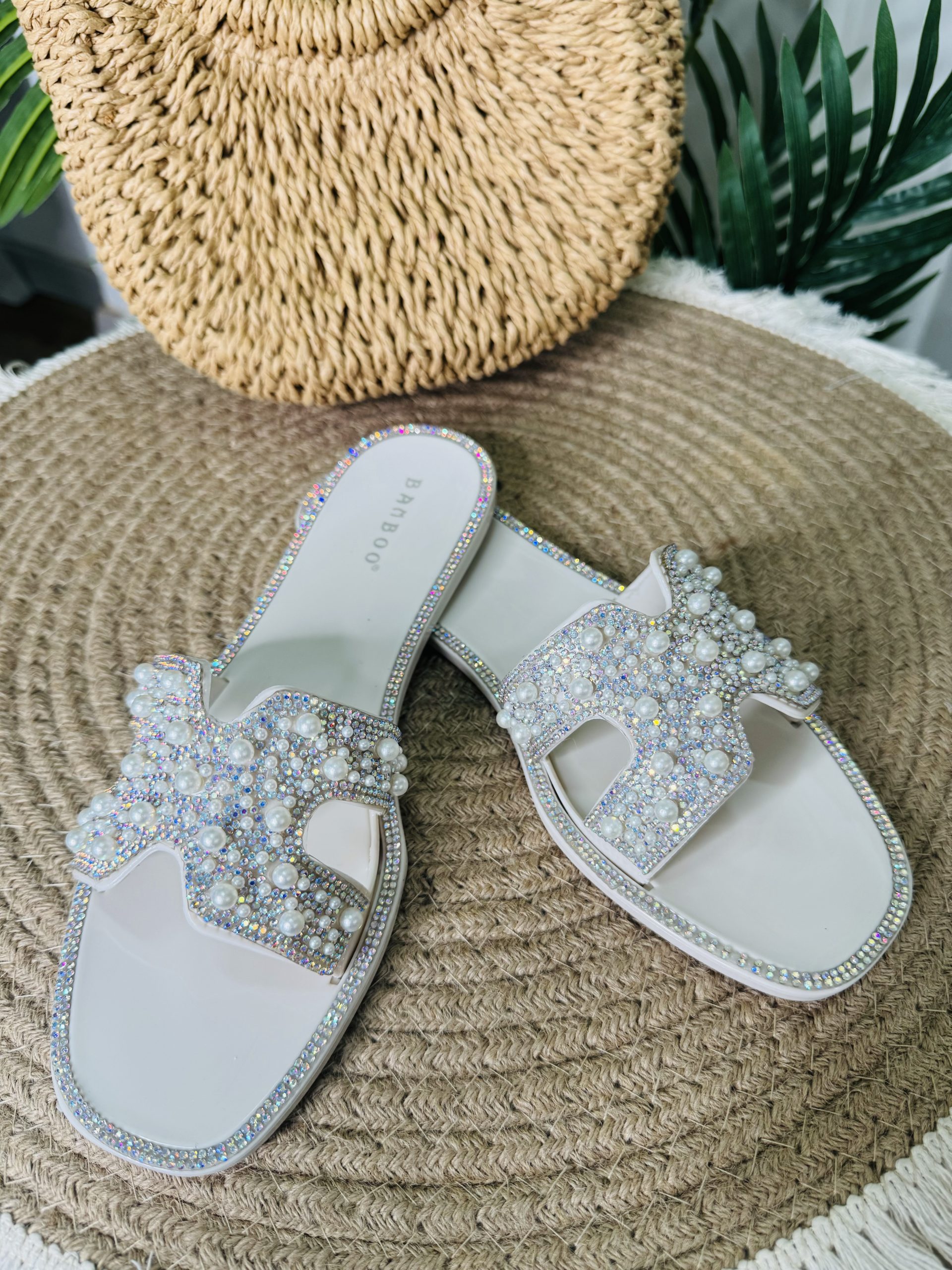 🤩 TENOR41 Sandalias planas con perlas e incrustaciones de pedrería. Diseño de greca en H. Ideales para un look fresco.