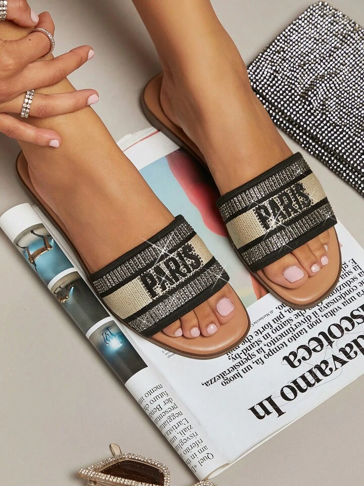 Sandalia plana tipo slide, abierta y con banda ancha decorada con pequeños diamantes y con letras bordadas (PARIS).