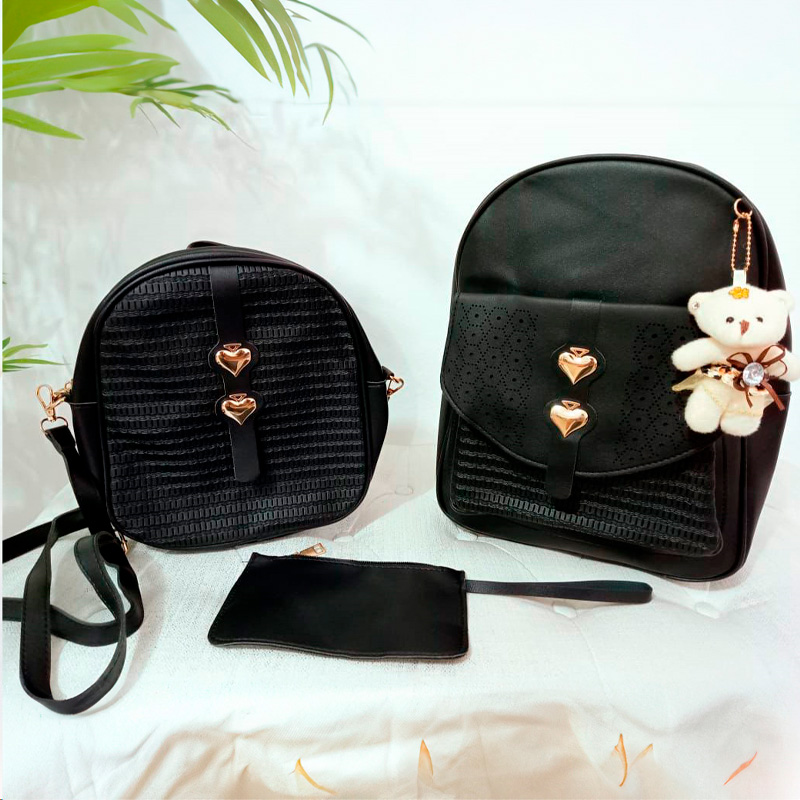 Set de tres piezas. Mochila con gran capacidad. Bolso que puedes usar de mano o cruzado con sus correas. Bolsita versátil puedes usar como cartera o cosmetiquera. Tactopiel de alta calidad. Detalles de corazones metálicos. Osito como colgante.