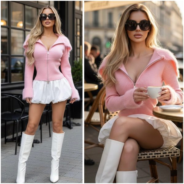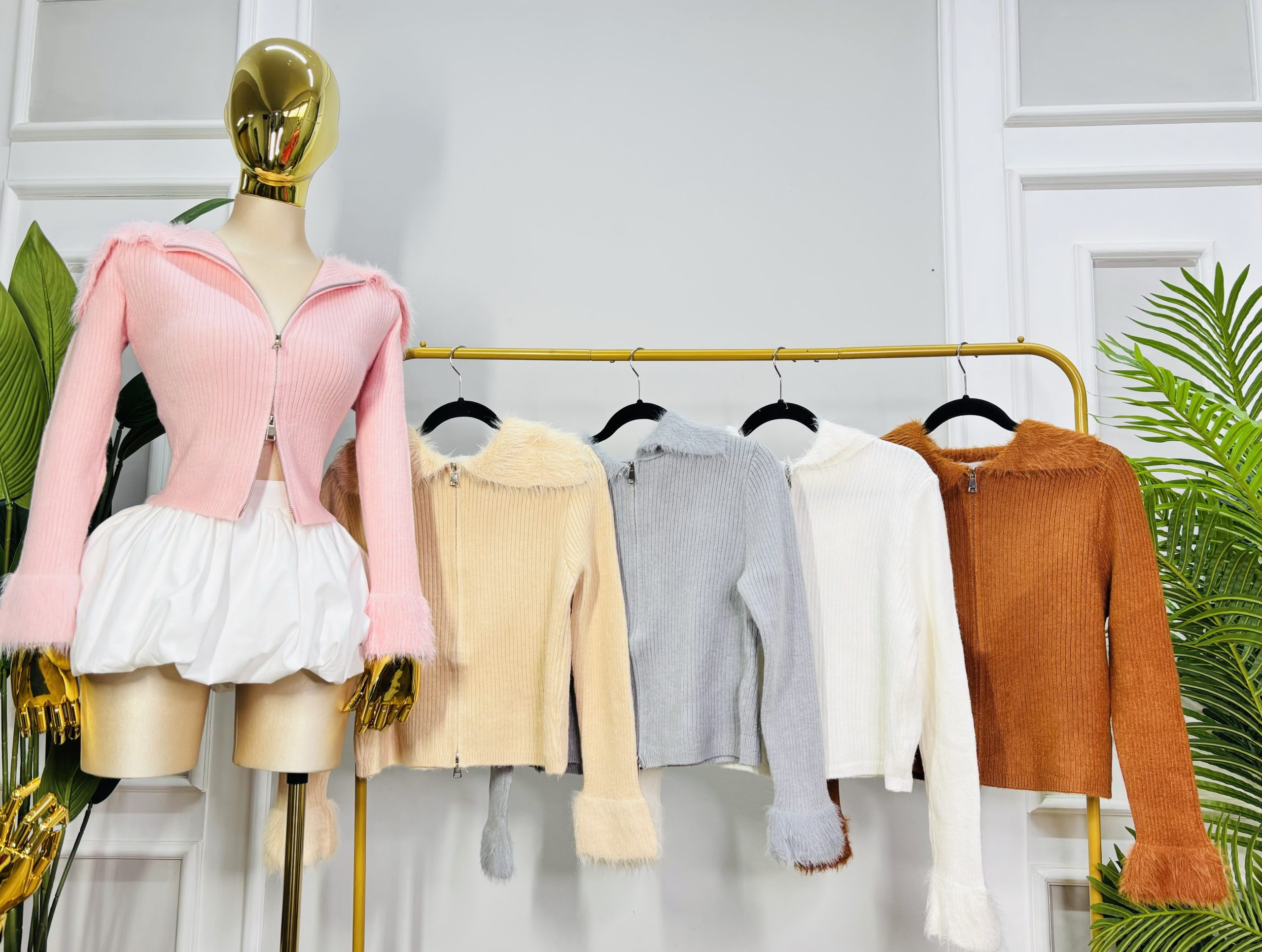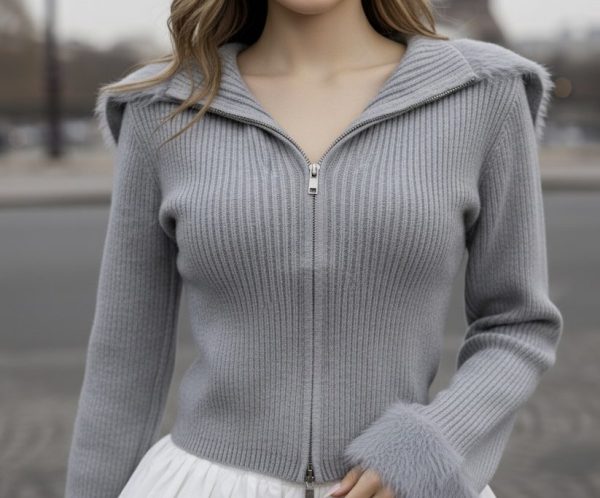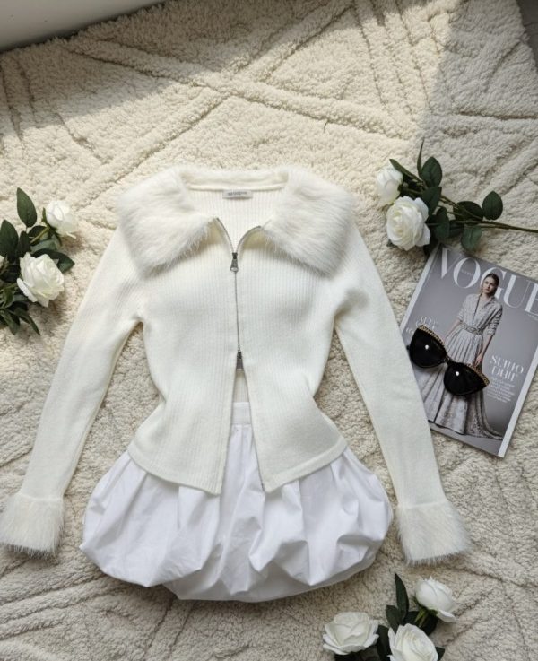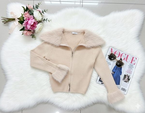 Sudadera acanalada de punto. Cremallera metálica frontal. Cuello y muñecas con diseño de peluche. Ligera y stretch.