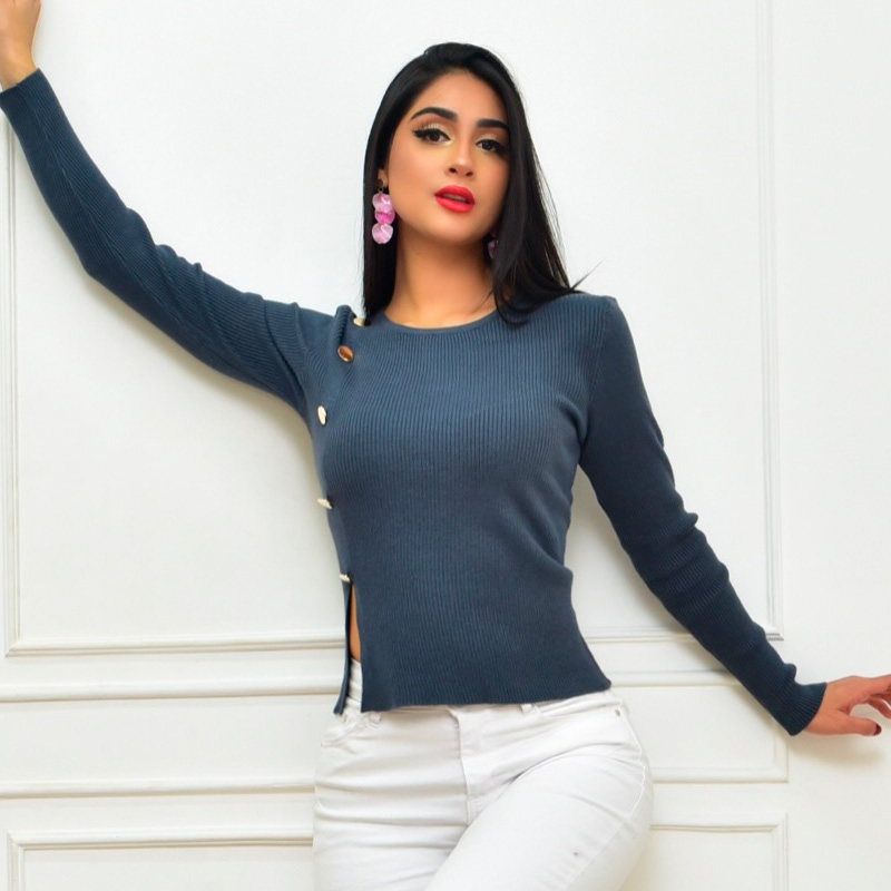 Suéter de cuello redondo y manga larga. Detalle de botones dorados laterales. Composición algodón. Stretch abarca de 5 a 13